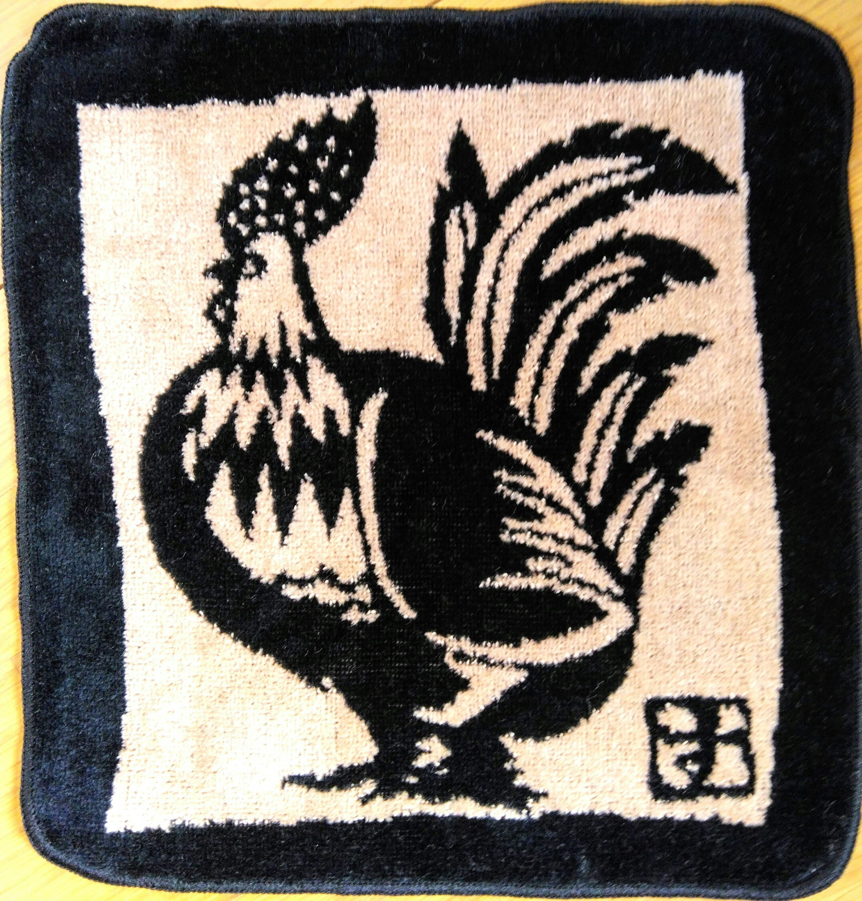 1950年代中頃、地元の業者に頼まれて”手ぬぐい”に「鶏」をデザインしました。美術作家でありながら、地元の中小零細業者に頼まれれば商品デザインを気軽に引き受けた賢二でした。この「鶏」をハンドタオルにしました。