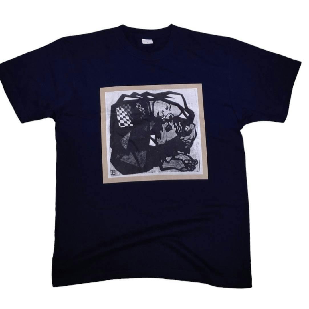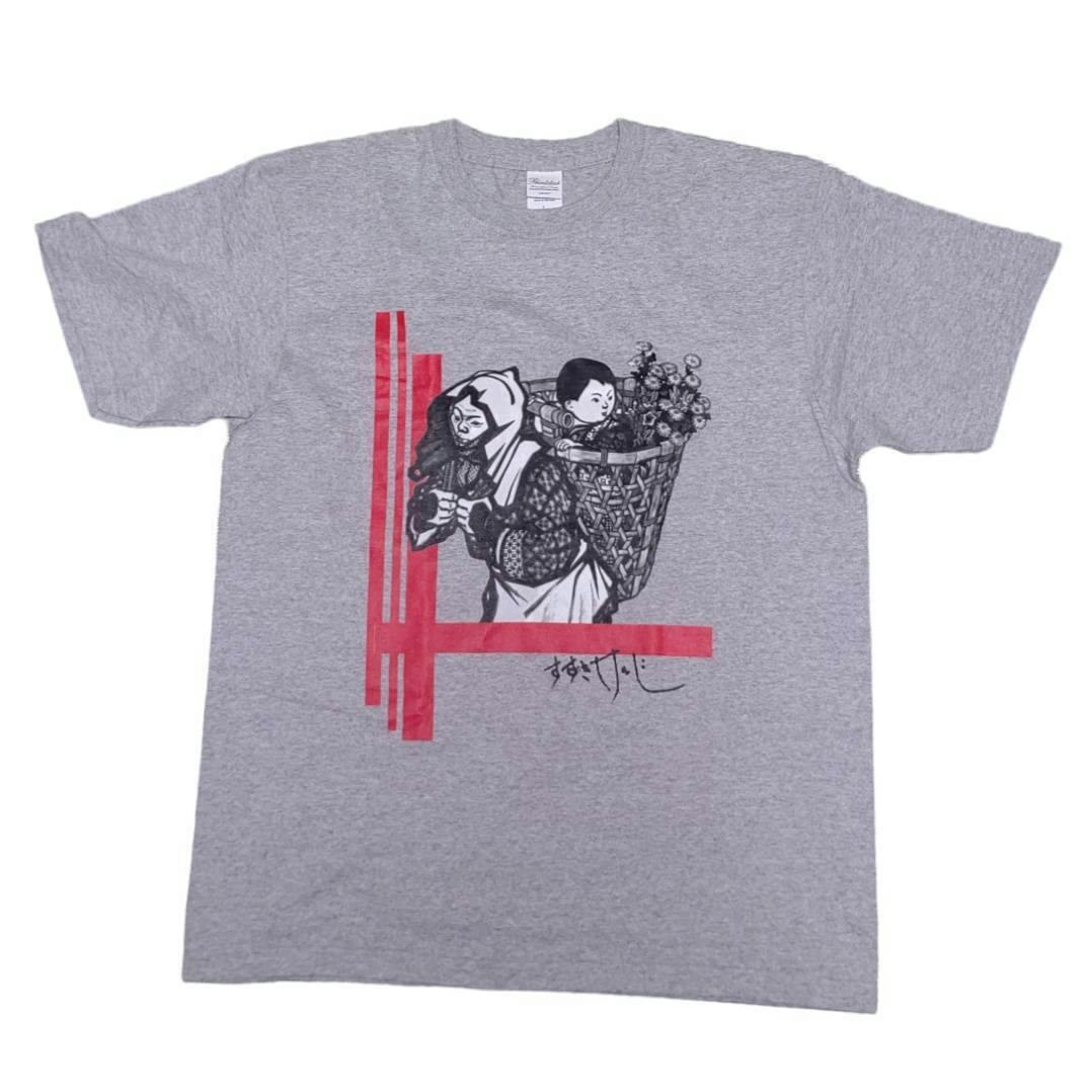 1961年頃制作の、賢二の代表作のひとつ。大型の作品(102.5X93.5cm)をTシャツにデザインしました。彫刻刀による繊細な線が、籠や農婦の衣服、花々に見られます。