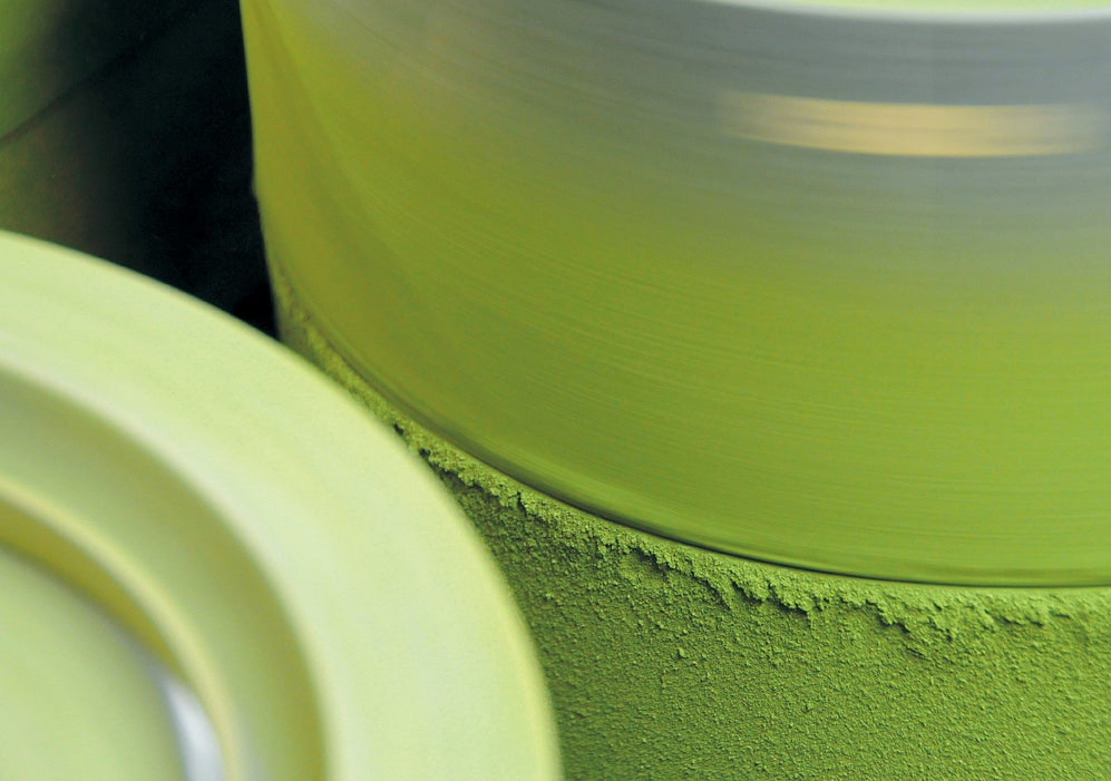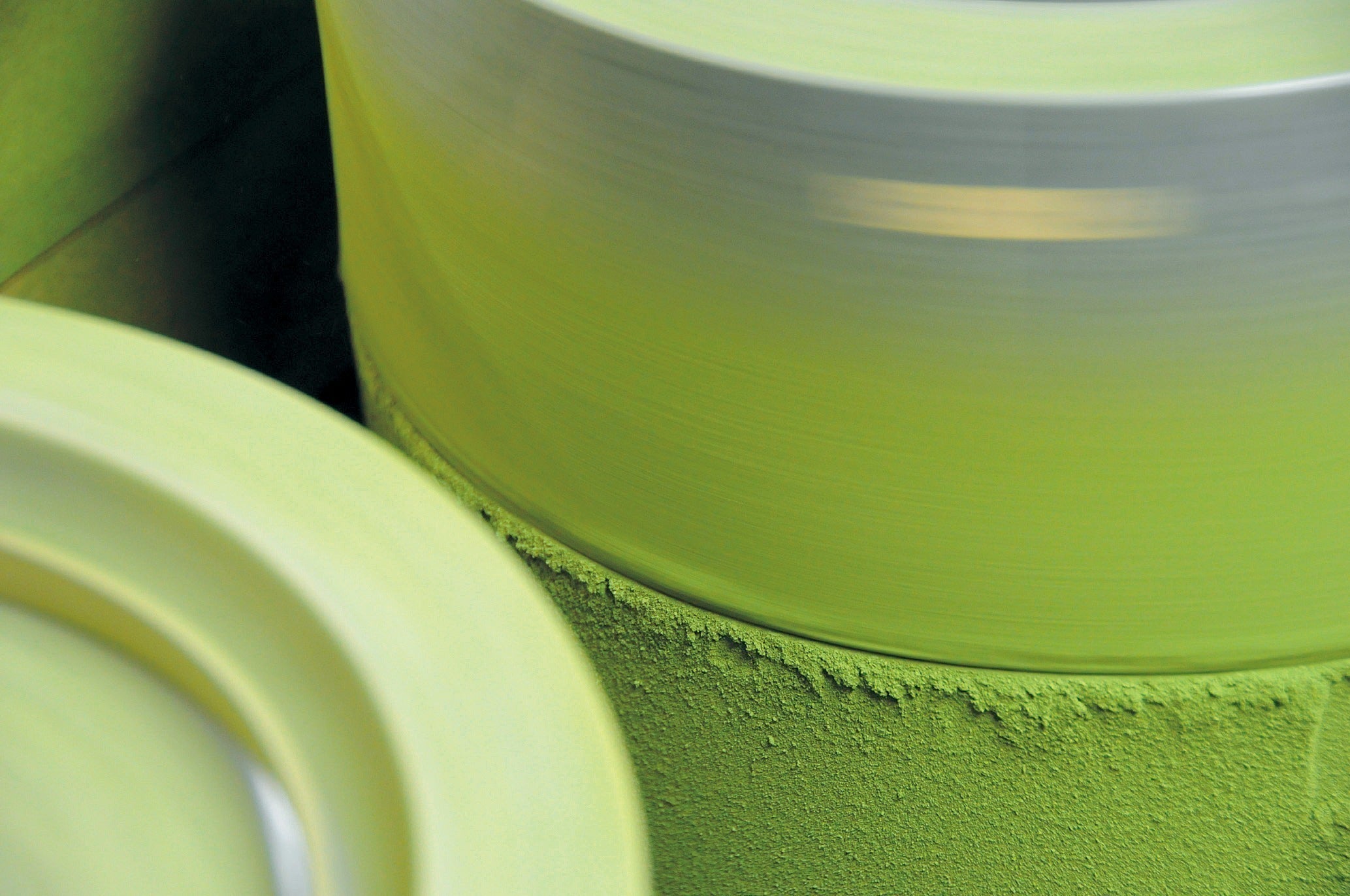 【挽き:石臼で時間をかけて丁寧に挽きます。(※全抹茶配合量の50%以上が石臼挽き)】