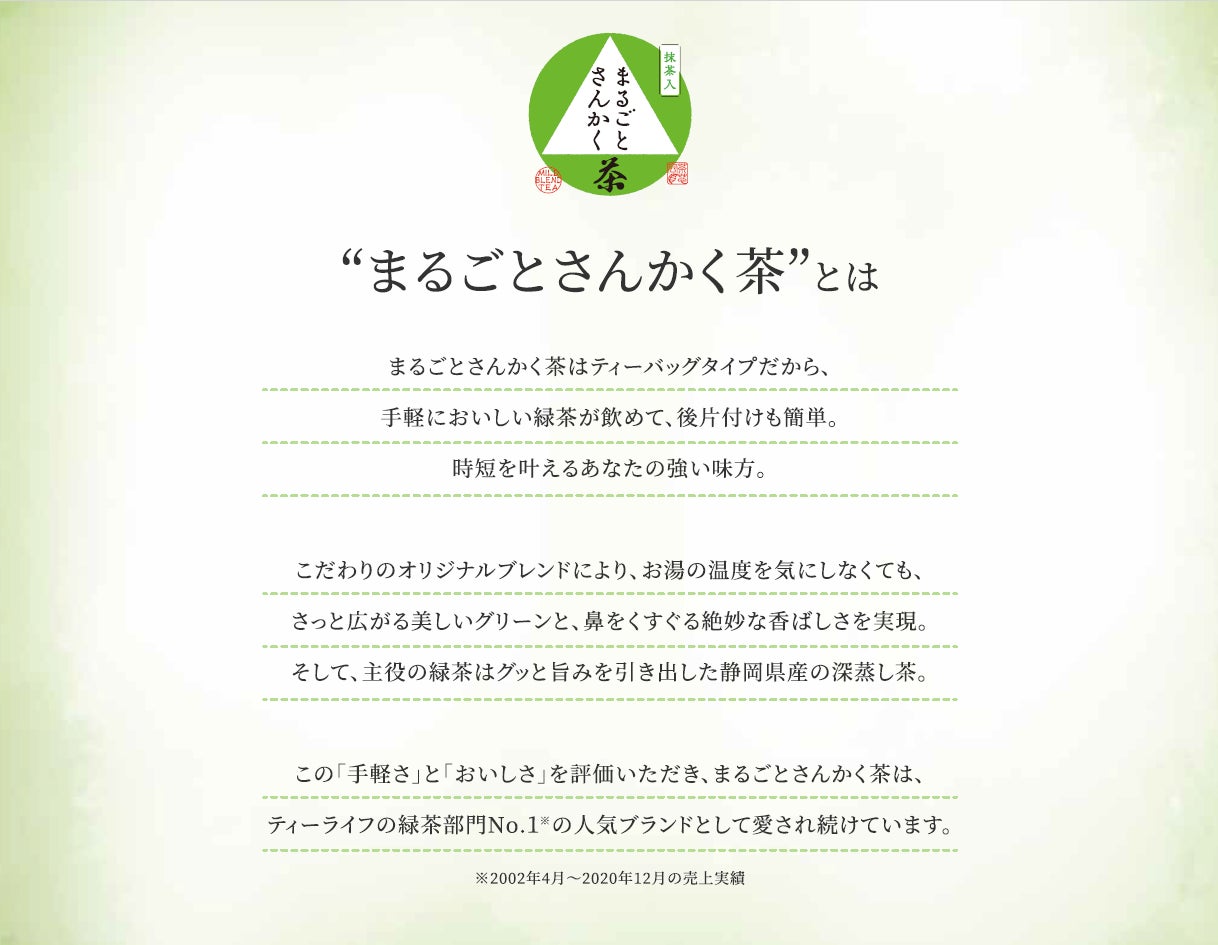 今回ご紹介する「まるごとさんかく茶」は、ティーライフ緑茶部門No.1のお客様からうれしいお声をたくさんいただくファンの多い商品です。