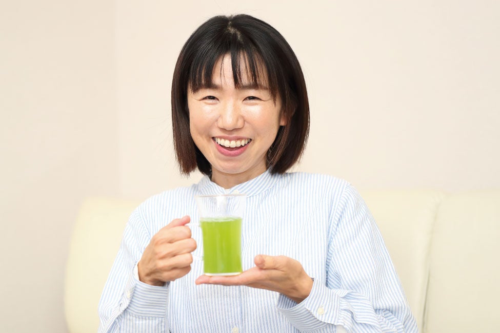 飲み始めて13年になりますが、まるごとさんかく茶は味わいのバランスが良いですよね。まず緑茶、抹茶の香りがふわ~っと。この香りが大好きで、全身に浴びたいくらい!淹れた時の新緑を彷彿とさせるような、きれいな緑色も幸せな気持ちになります。この色は他のメーカーのお茶には無いですよね。初めて飲んだ時「自分が探し求めていた味」だなって思ったんです。渋みもなく、まろやかで体に染み渡るような感じ。これ以外飲みたいと思えなくなりました。まるごとさんかく茶さえあれば生きていけるってくらい大好きです。