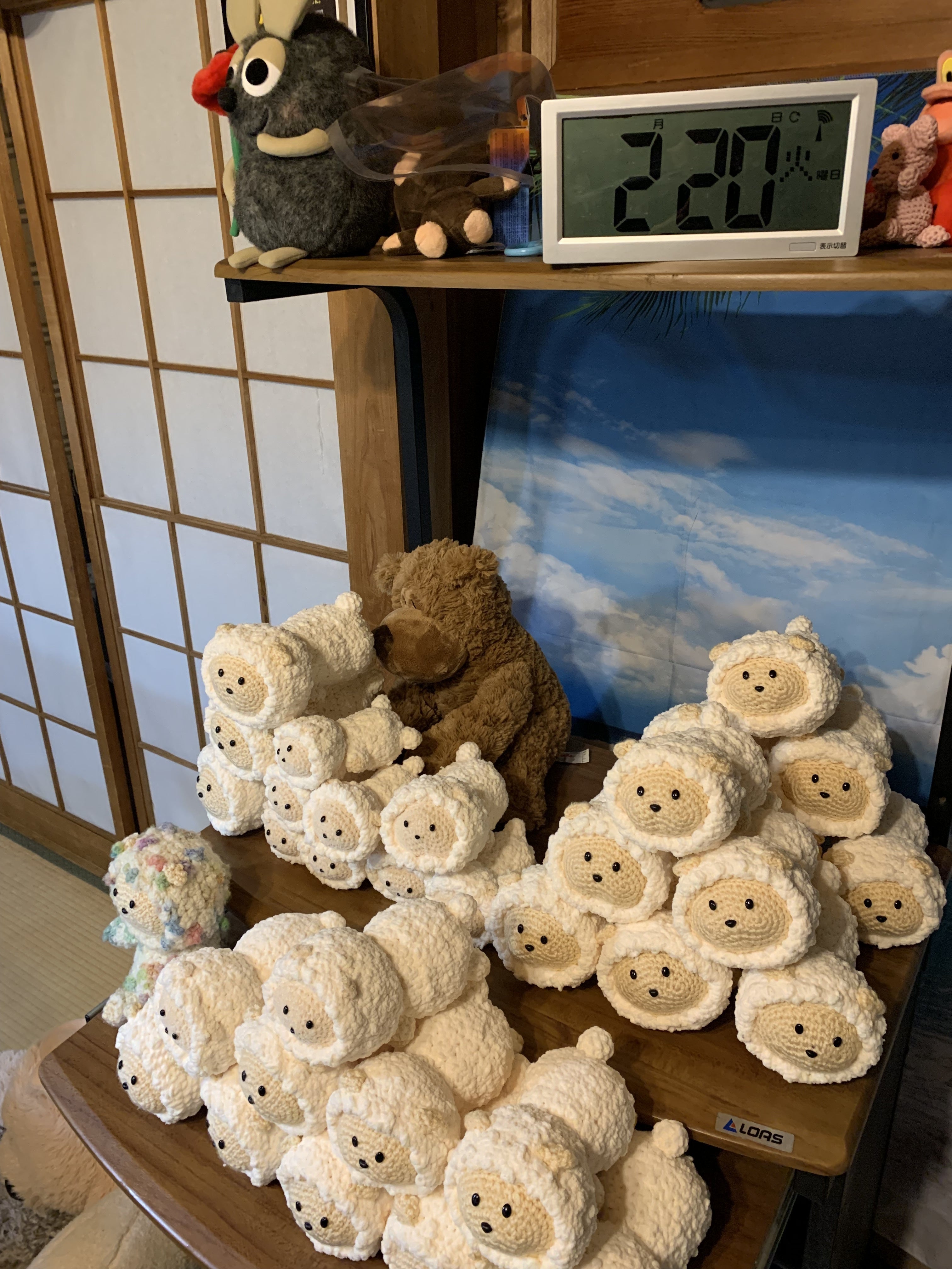 編み物歴は20年、作品数は1000作品を超えました。2021年に治療費の足しにと「編みぐるみ」の販売を始め、これがとても好評で沢山の方に購入いただき、この2022年では1年で178作品を製作、販売するに至りました。