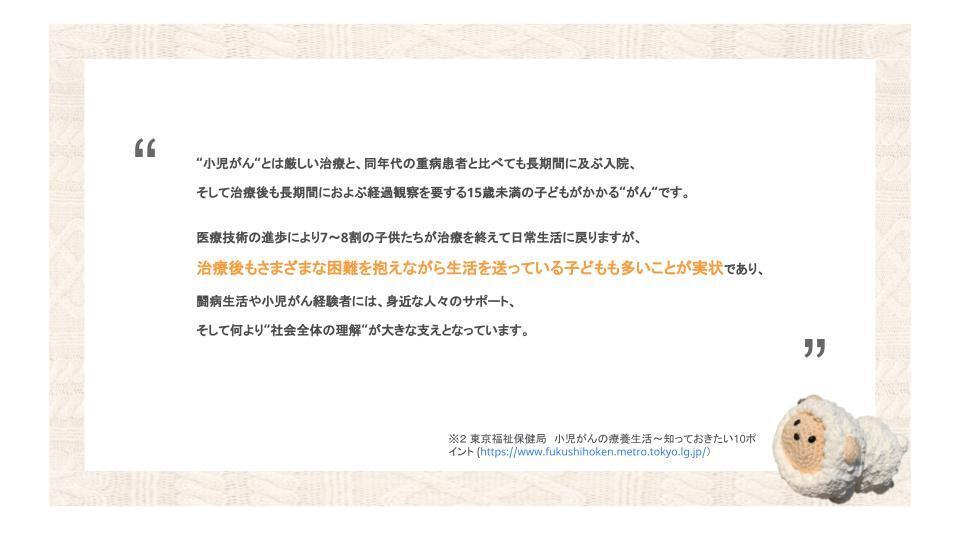 医療技術の進歩により7〜8割の子供たちが治療を終えて日常生活に戻りますが、治療後もさまざまな困難を抱えながら生活を送っている子どもも多いことが実状であり、闘病生活や小児がん経験者には、身近な人々のサポート、そして何より“社会全体の理解“が大きな支えとなっています。」※2