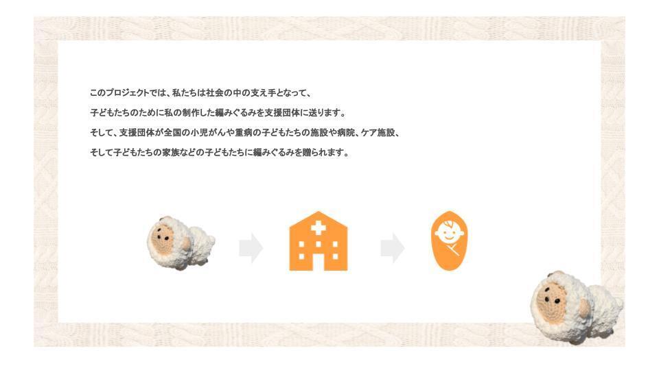 つまりこのプロジェクトを通して、子どもたちに編みぐるみを贈ることは、病院の働き(治療)だけでなく、社会生活全体において、なくてはならないものです。 このプロジェクトでは、私たちは社会の中の支え手となって、子どもたちのために私の制作した編みぐるみを支援団体に送ります。