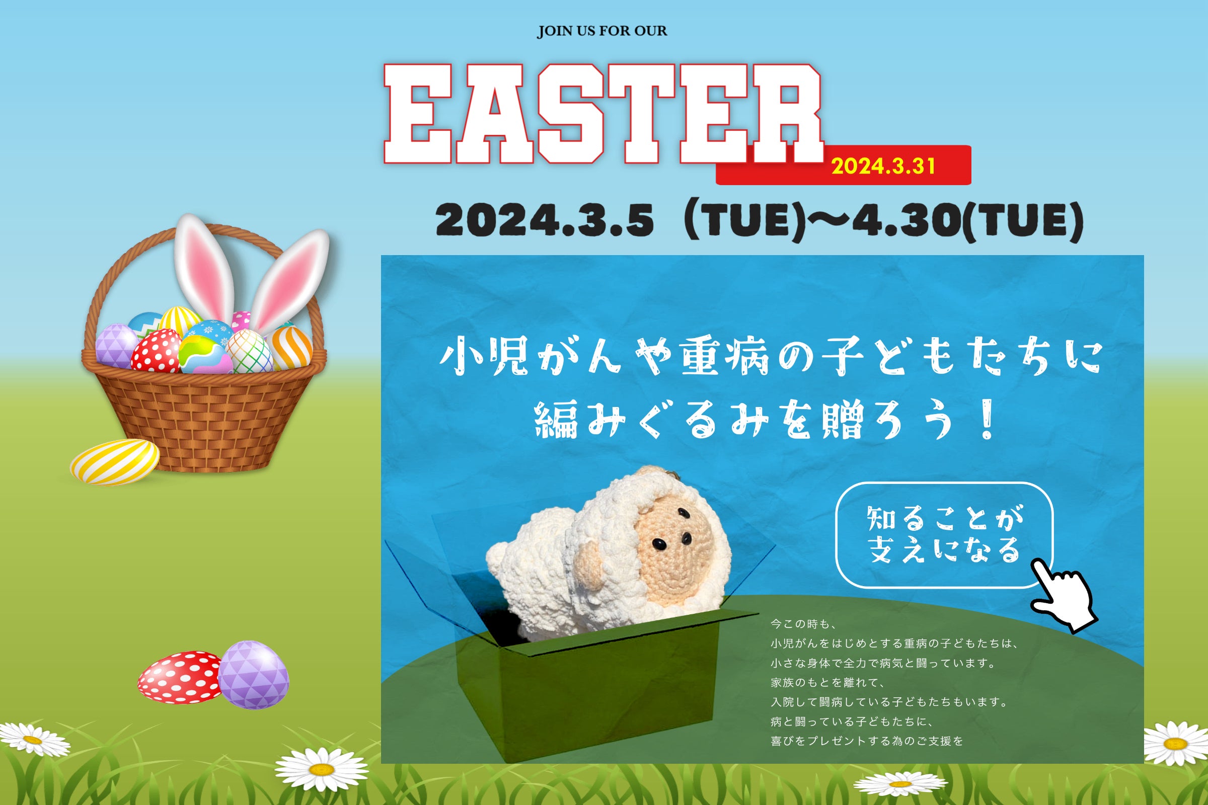 イースターおめでとうございます!西宮も桜が咲き出しました。 春は何故かウキウキしますね。この春、新しい場所で新しい生活を始める病を持った子どもたちが、力強く初めの第一歩を踏み出すことができますように。 生かされ生きて、この春を皆さまと一緒に春を迎えることができたこと心より感謝しています。 本当にいつもありがとうございます。もっともっとこのプロジェクトが広がりますように皆様、ご支援と暖かいお気持ちも、本当に感謝しています。いつもありがとう。たかお編みぐるみ工房 原田隆夫