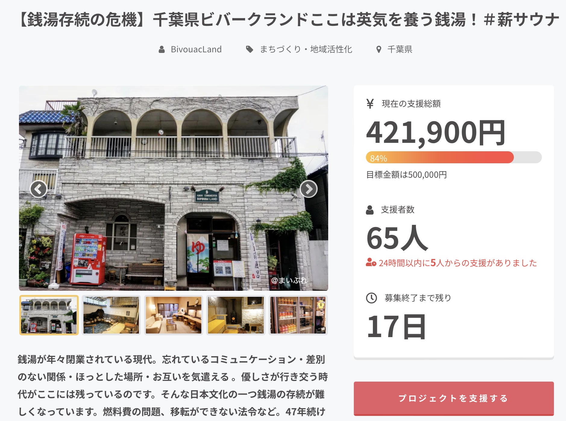 2024/06/13 13:4165人ものご支援いただき誠にありがとうございます。現在、達成率84%ととなりました。65人の応援いただいている皆様のためにも残りの17日でできることを挑戦していきます。【リターン追加しました!】是非、皆様のご意見をください。ご希望に合わせてリターンを追加していきます。人気の薪サウナ回数券をリターンに追加させていただきました。【スポンサー様内容変更いたします!】ありがたいことにスポンサー様リターンをご購入いただいております。そこで、皆様のご意見を聞かせていただき内容(1年掲載から2年掲載)を変更させていただきました!※掲載中のリターン詳細は修正が不可のため、活動報告にてご案内させていただきます。①10万円【ビバークラウンドスポンサー枠】 『休憩スペース』に企業名、個人名、サービス名など掲載いたします。掲載大きさ:420㎜×594㎜ → 改訂A3サイズ297×420㎜掲載期間:2024年7月〜2025年6月末まで → 改訂2024年7月〜2026年6月末まで②30万円【ビバークラウンドスポンサー枠】 掲載大きさ:594㎜×841㎜掲載期間:2024年7月〜2025年6月末まで → 改訂2024年7月〜2026年6月末まで②50万円【ビバークラウンドスポンサー枠】 『休憩スペースと洗い場』に企業名、個人名、サービス名など掲載いたします。掲載期間:2024年7月〜2025年6月末まで → 改訂2024年7月〜2026年6月末までより多くの方に銭湯の現状を知っていただきたく、クラファンのURLをシェアしていただけますと大変嬉しいです。 もっと見る