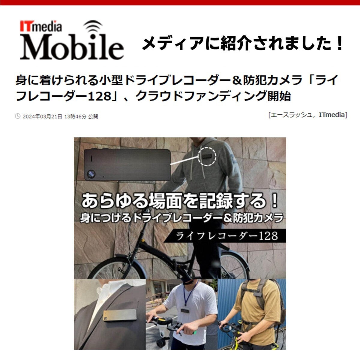 サポーターのみなさまへPAPAGO JAPANプロジェクト担当です。たくさんのご支援ありがとうございます!今回は、ITメディアモバイル掲載情報のご紹介です。身に着けられる小型ドライブレコーダー&防犯カメラ「ライフレコーダー128」、クラウドファンディング開始https://itmedia.co.jp/mobile/articles/2403/21/news134.html●クラウドファンディングhttps://camp-fire.jp/mypage/projects/747332いろいろな方に手に取っていただきたく、SNS拡散のご協力お願い申し上げます!引き続き、応援よろしくお願いいたします。PAPAGO JAPAN株式会社プロジェクト担当