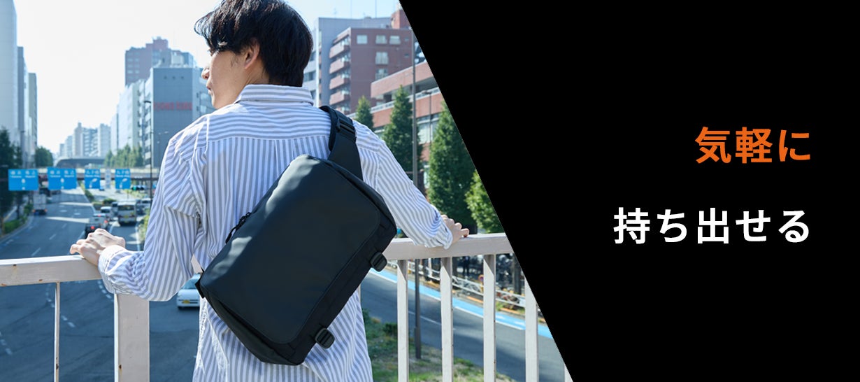 スリングバッグがPCに対応することで、気軽にPCを持ち出せます。