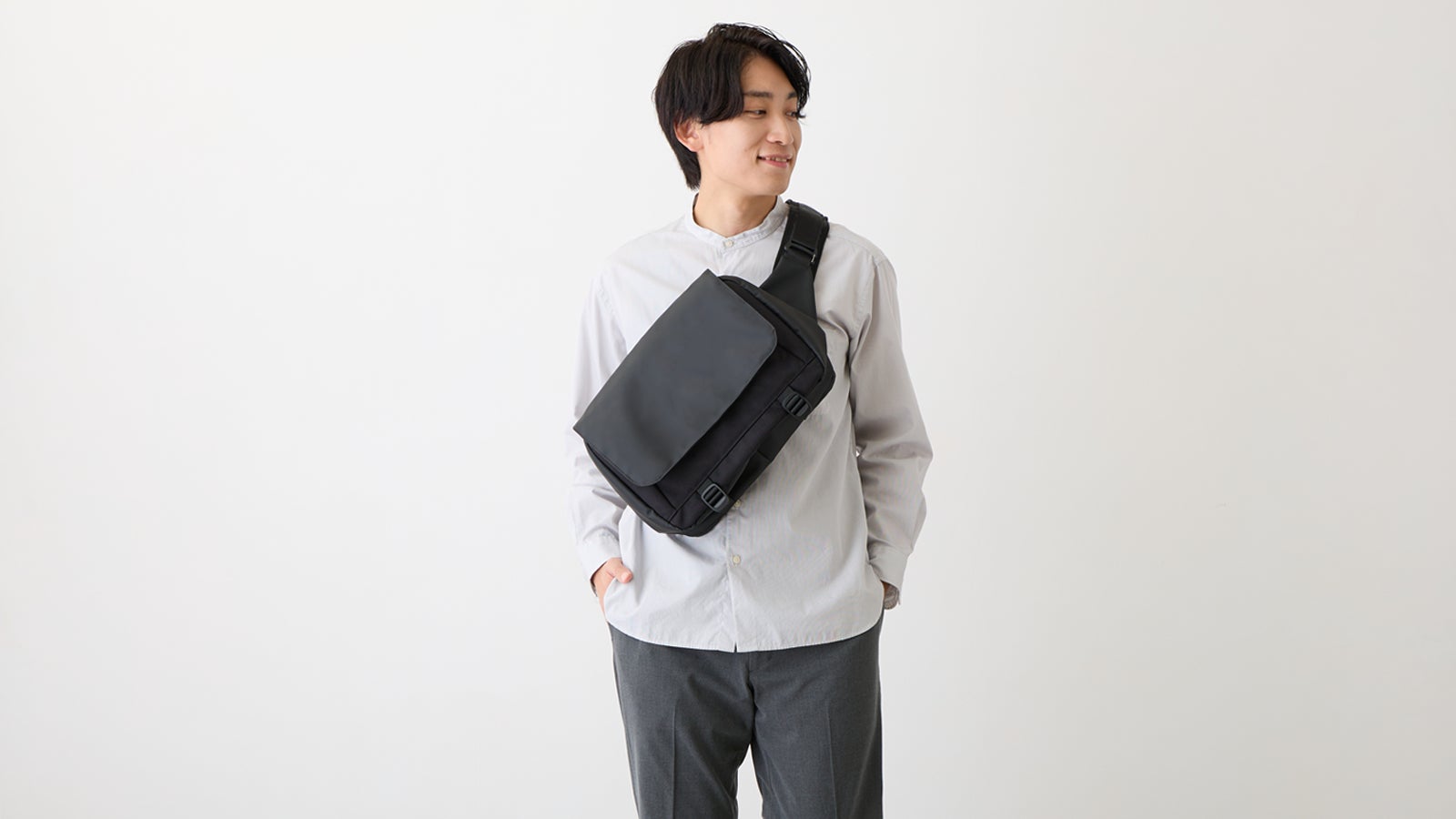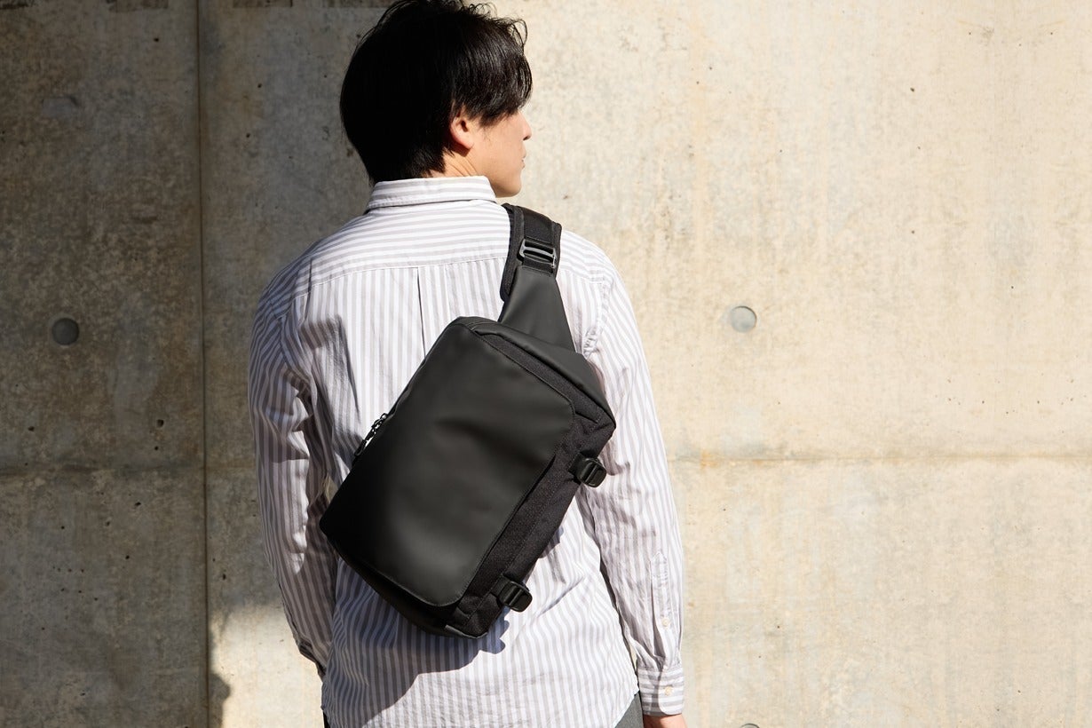 PC対応でさらに進化した傷に強く汚れても簡単に綺麗になる。大人の日常使いに最適なスリングバッグ。