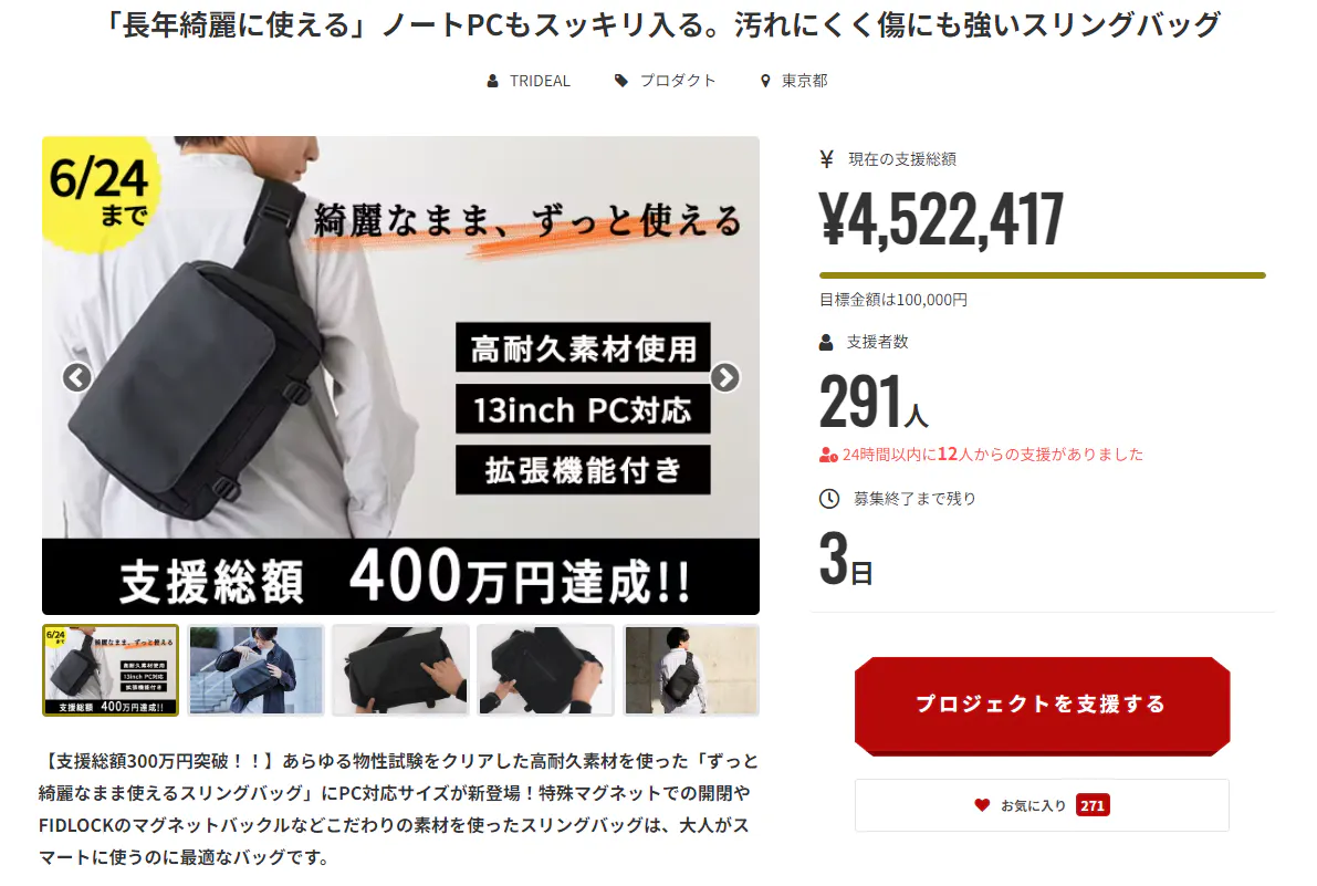 それでは、耐久性が高くずっと綺麗に使えるPC対応のスリングバッグを1人でも多くの方にお届け出来るのを楽しみにしております。
