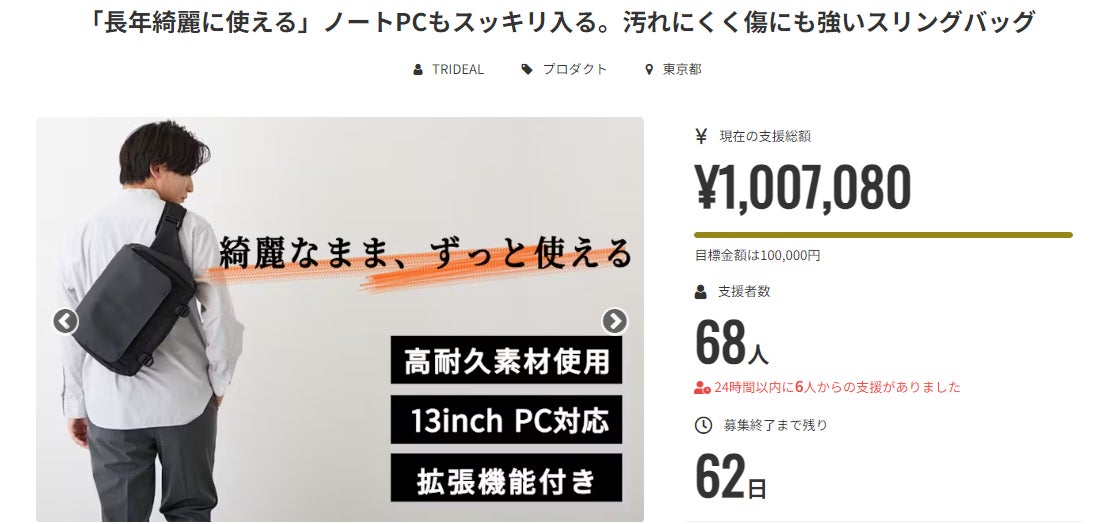 machi-yaとCAMPFIREユーザーの皆さま、こんにちは!TRIDEAL運営チームです。100名を超える方からのご支援のおかげで、支援総額が150万円を突破しております!さらに多くの方にタフビッグスリングバッグをお届けできるように、チーム一同さらに広告・告知活動に力を入れて参ります。本日は同時開催中のプロジェクトのご紹介です。「綺麗が持続する」色褪せず、傷にも強い。高耐久素材でタフに使えるトートバッグコットンキャンバスに高耐久樹脂をコーティングした、ずっと色褪せずに使えるキャンバストートになっております。こちらも事前に行ったMakuakeでのクラウドファンディングでは280万円を超える支援を頂いた商品になります!TRIDEALのデザイナーで有る私自身トートバッグが好きで以前から通勤やプライベートでキャンバス製のトートを好んで使っていましたが、1年も使えば角が擦り切れたり、日焼けして色褪せてしまったり短いスパンでの買い替えを余儀なくされてきました。TRIDEALがこだわる耐久性と、キャンバストートの特長であるラフに使える気軽さを両立したトートバッグが作れないかと試作を重ね完成したプロダクトになっております。現在CAMPFIREにてプロジェクトを実施中ですので、ぜひご覧ください。一番割引率が高いリターンもまだ残っておりますので、ぜひタフビッグスリングバッグと合わせてこちらのご支援もご検討頂けますと幸いです!宜しくお願い致します。商品ページはこちらTRIDEAL運営チーム※※公式アカウント※※Instagram:https://www.instagram.com/trideal_official/公式ライン:https://lin.ee/tHWScp0公式ストア:https://trideal.jp
