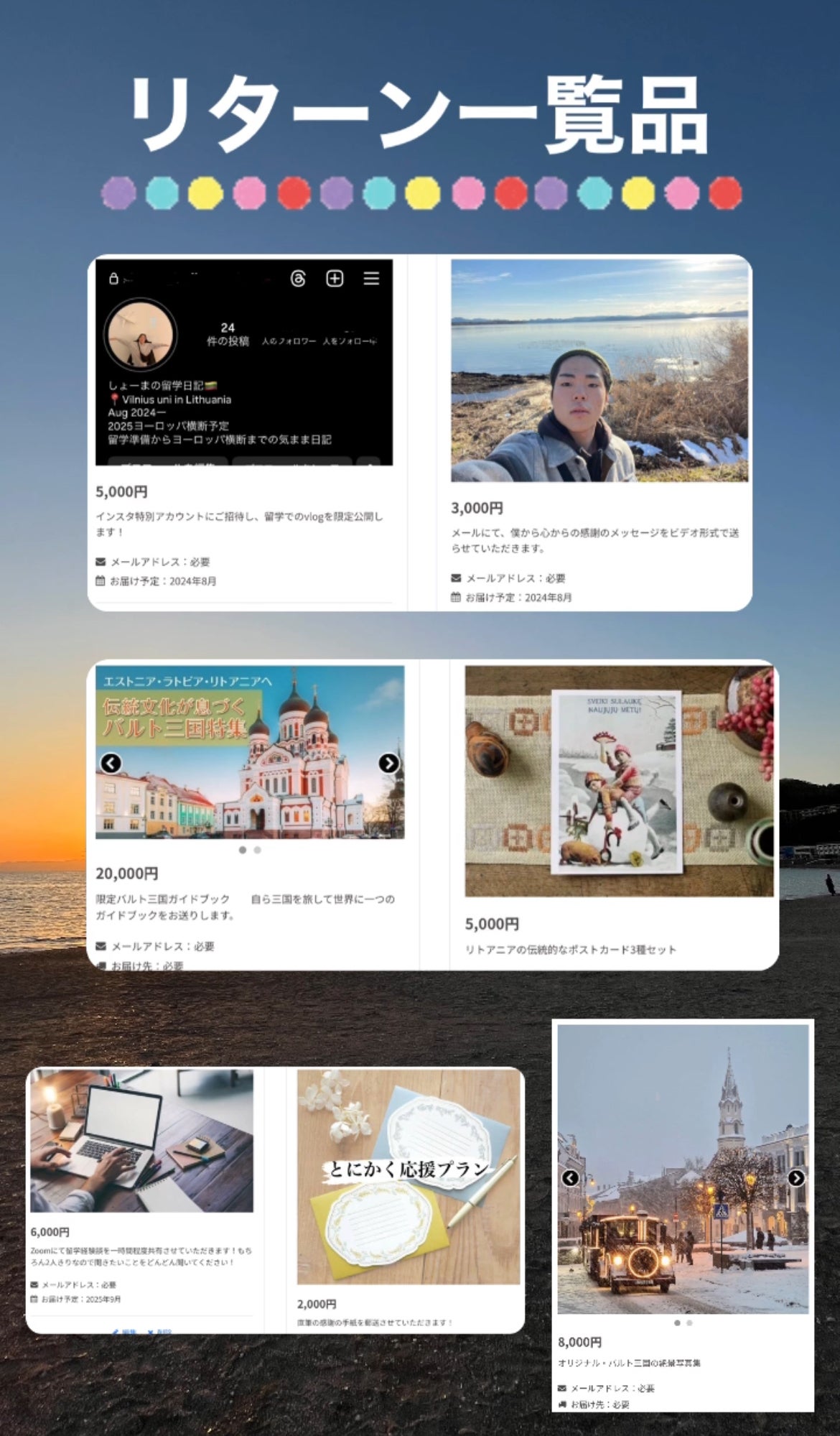 留学期間中のSNSでのVlog形式の動画の最後に10秒程度ご支援者様のお名前を掲載します。