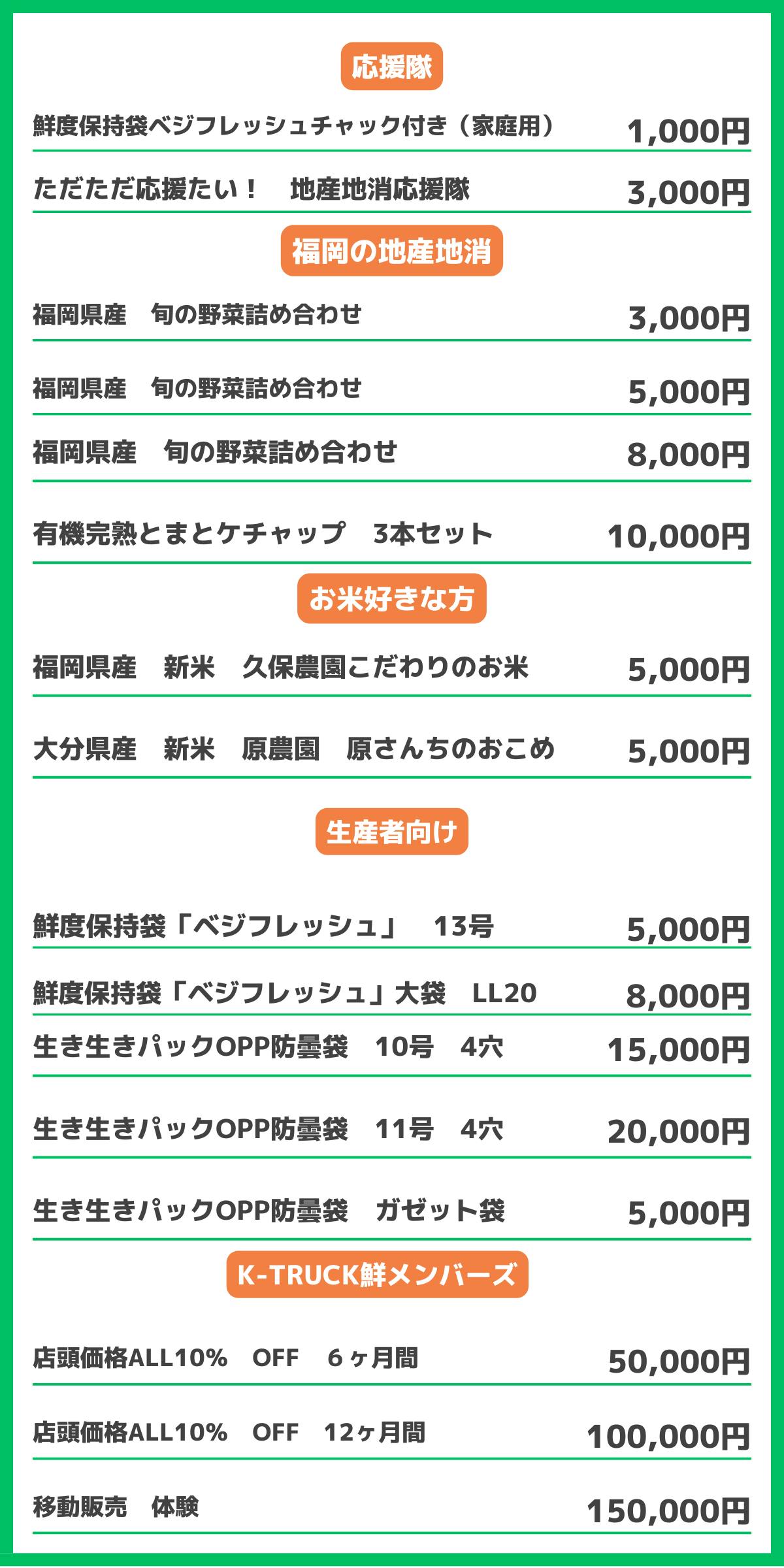 このプロジェクトが成功し、移動販売の動く産直八百屋『K-TRUCK鮮』をオープンすることができたときは、福岡県内の農家さから直接農産物を仕入れて、ふくおかの新鮮で旬の農産物をいつまでも地元の方々にたべて頂けることをお約束します。