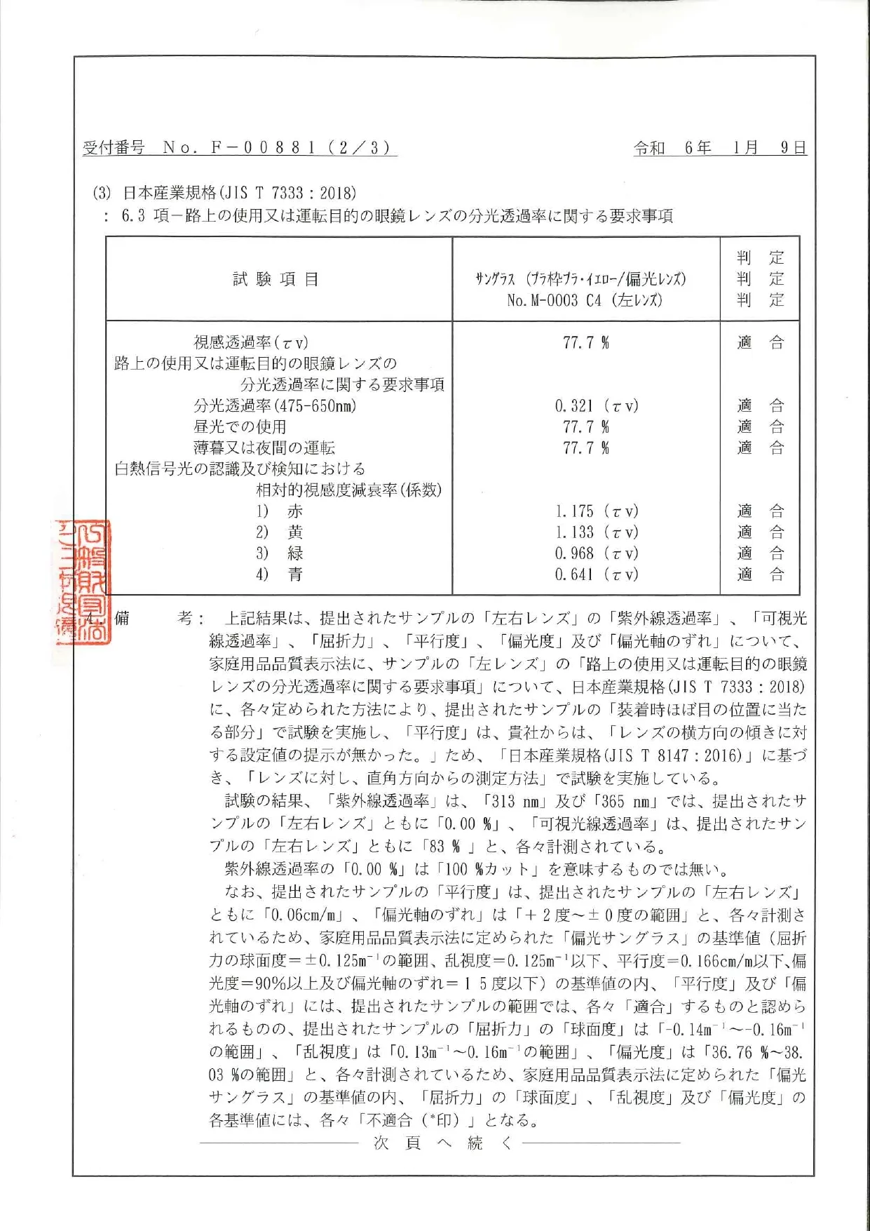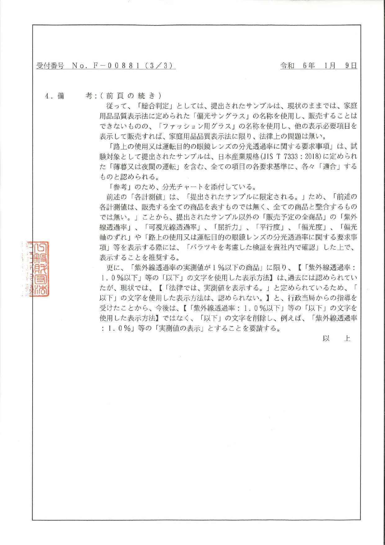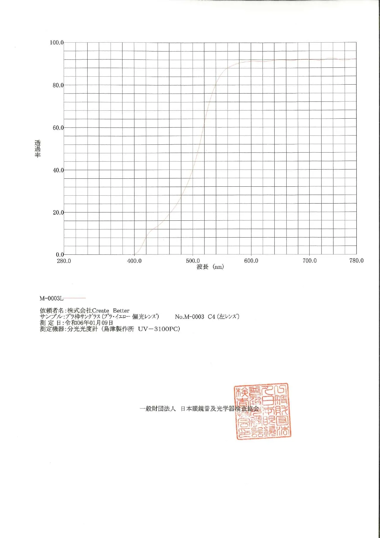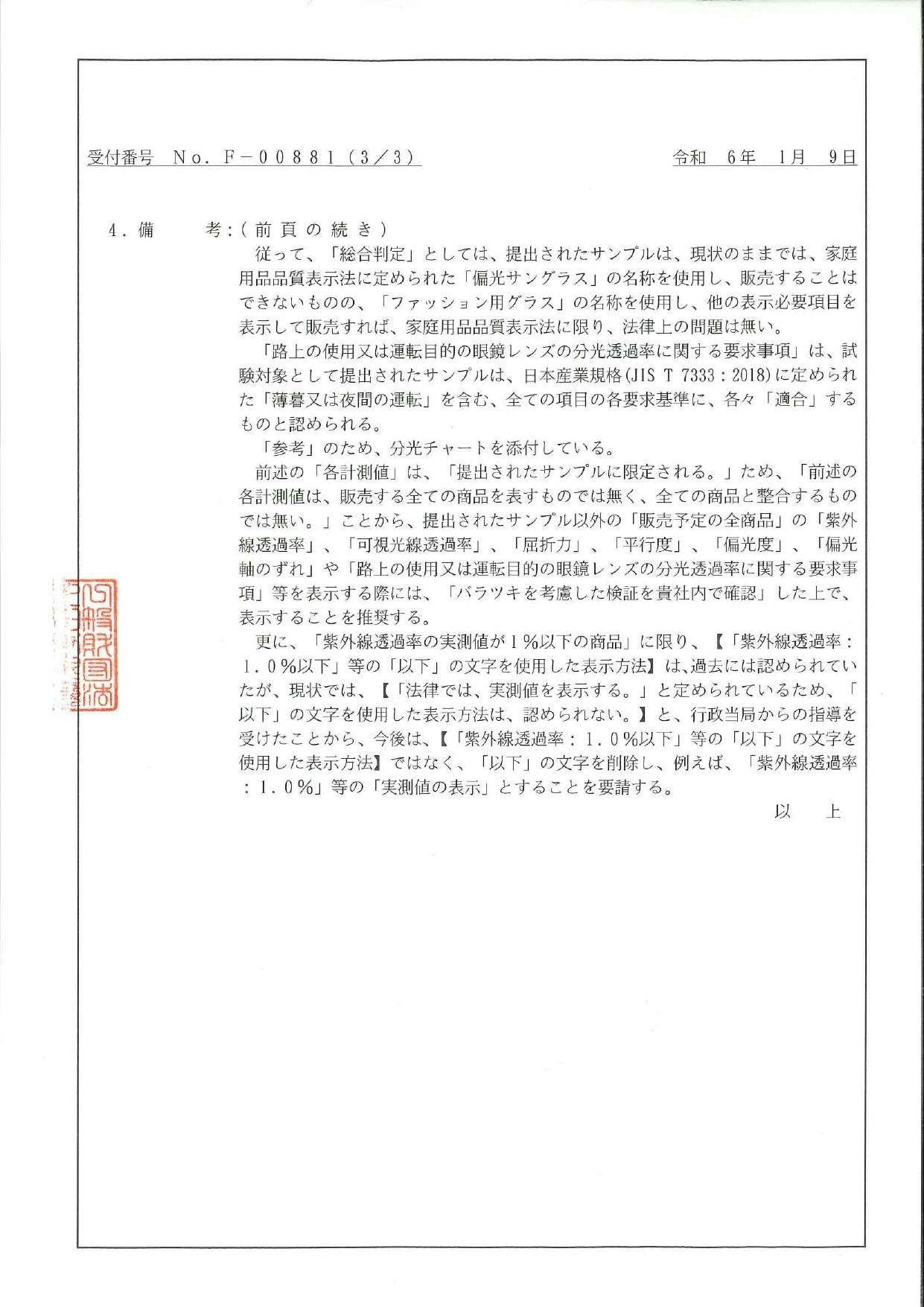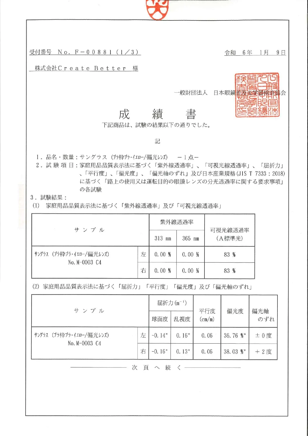 (2024年1月9日株式会社Create Betterから日本眼鏡普及光学器検査協会に提出サンプル限定試験成績書)