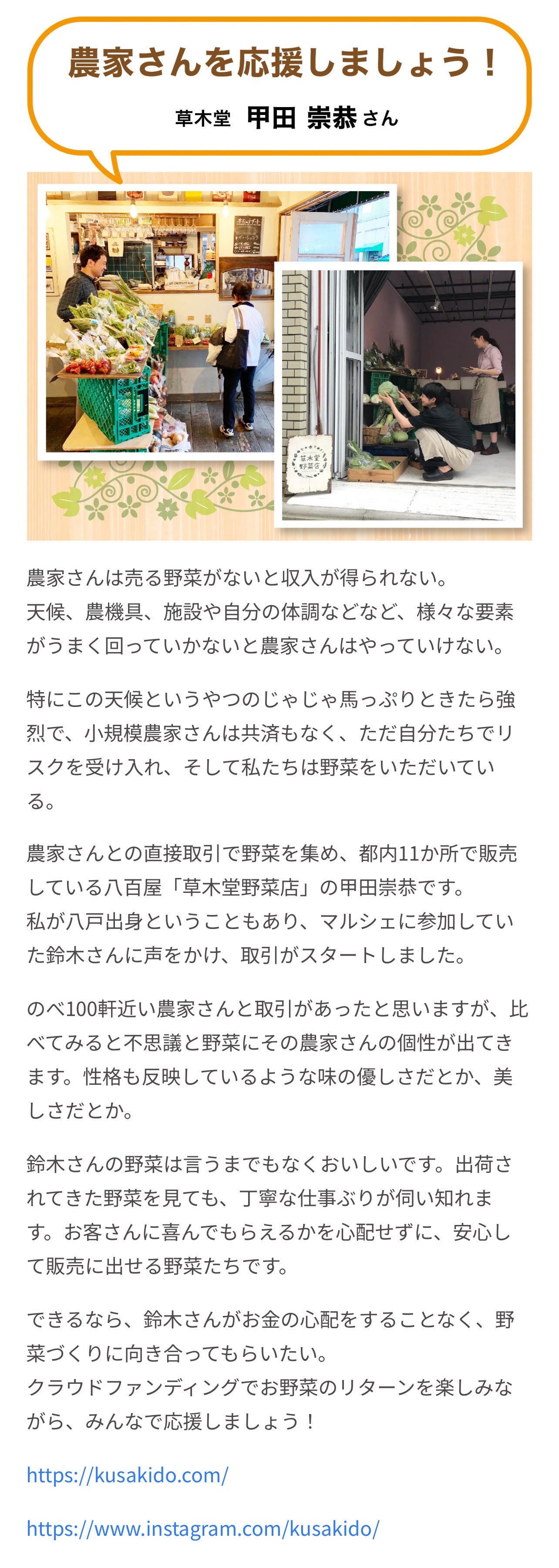 群馬県高崎市を拠点に、都内11箇所で野菜店を運営されている、草木堂野菜店 @kusakido 甲田 崇恭さんから応援メッセージを頂きました!