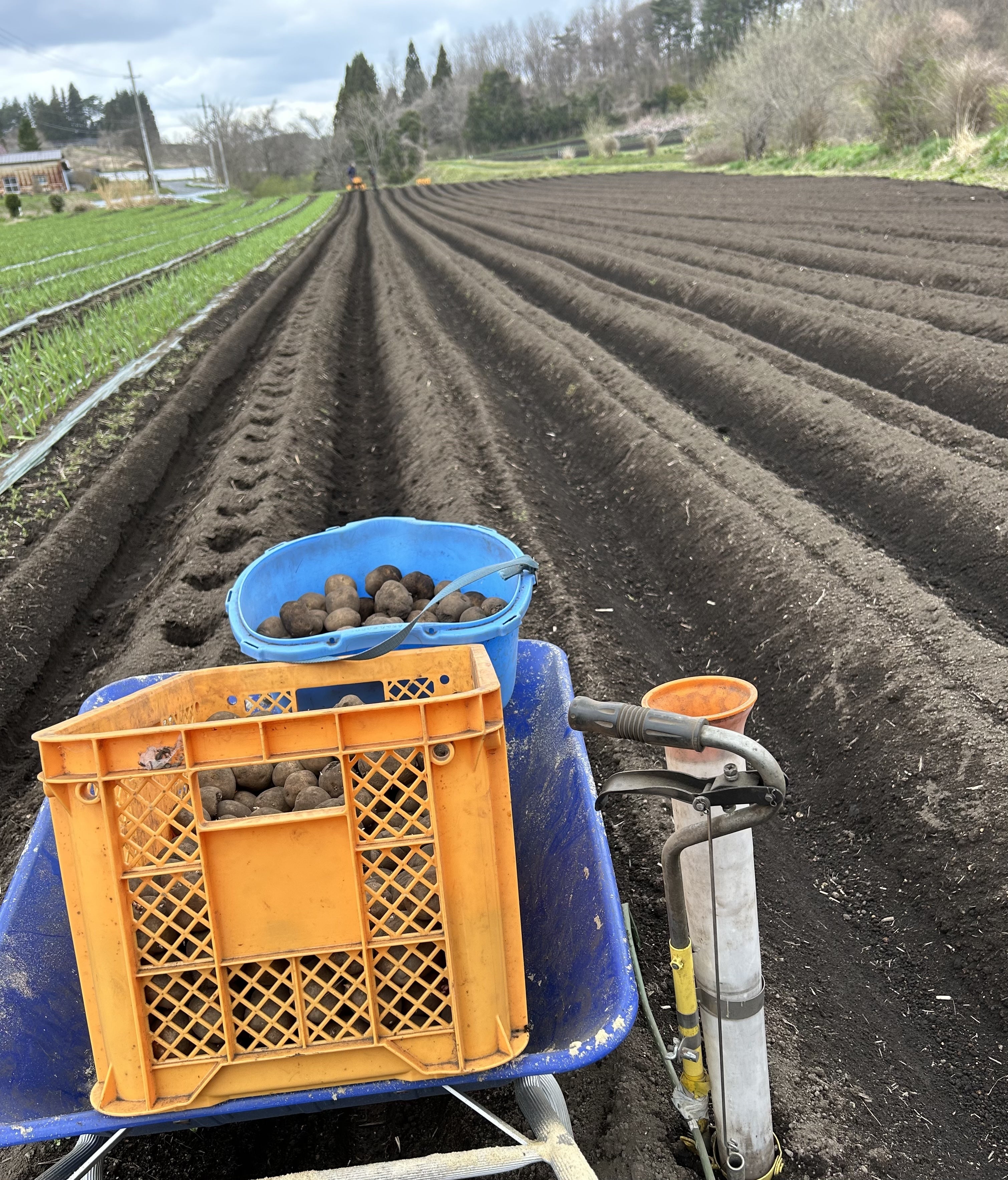 福祉作業所のメンバーにお手伝いいただき、先日、紫菊芋の植え付けが無事に終了しました!その合間に、夏野菜用の畝立て、マルチ貼りをし、こちらも何とか完成。この後、春の種まきスケジュールとしては、春大根(春師匠)→おくら(東京五角)→大豆→長芋→ごぼう(柳川理想)と、植えていく予定です。順調に進めばの話ですが‥4月上旬に植えた、夏人参(恋夏れんか)ビーツ(デトロイトダークレッド)も発芽してきました。いつも、春の嵐で発芽後の苗がダメージを受けるのですが、今のところ、それほど強い風もなく、この後も順調に生育してもらいたいものです。引き続き、作業の進み具合や、生育状況など、その都度お伝えしていきたいと思います。よろしくお願い致します!