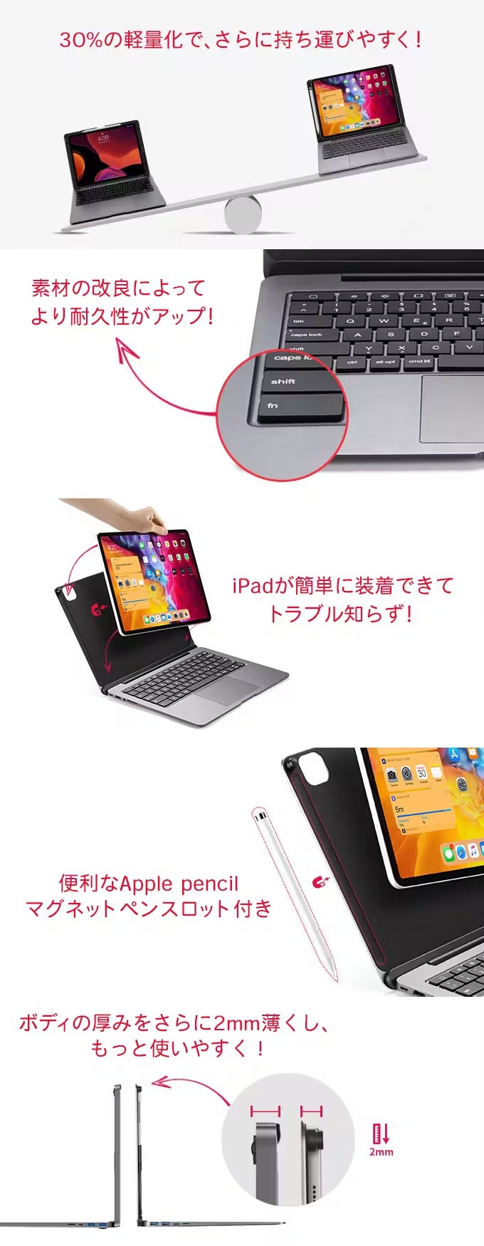 トラックパッドや独自のオールインワンハブ設計など新しくアップデートされた多くの機能を兼ね備えており、あなたのiPadをより快適に、そしてクリエイティブなものにしていきます。