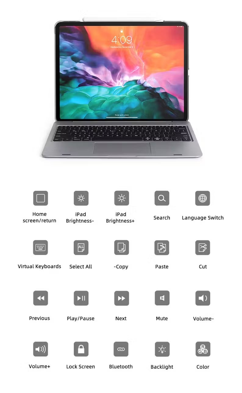 特別なコマンド専用のファンクションキーを使用して、iPadの音量、明るさ、その他の設定をすばやくタップするだけで簡単に調整できます。