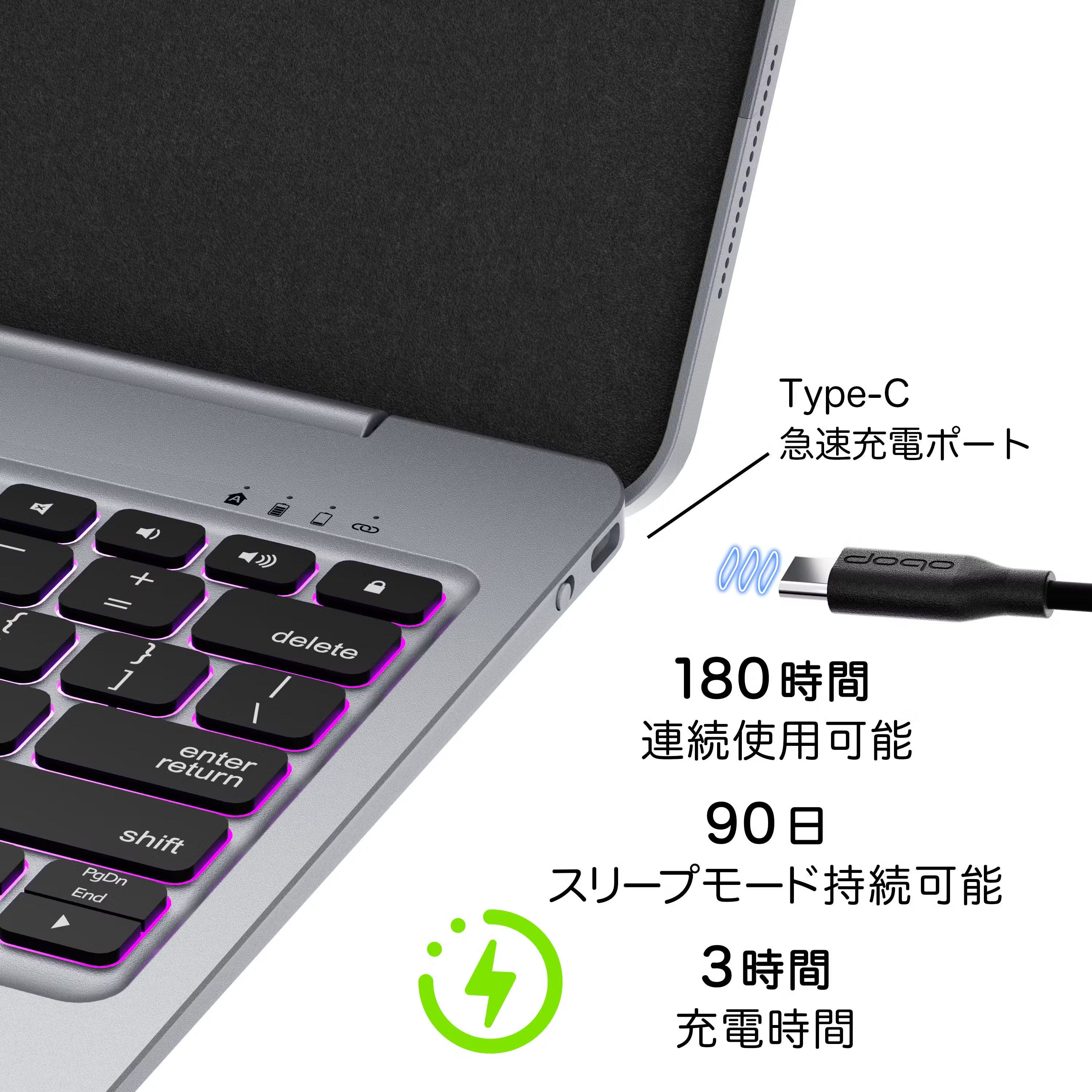 充電時にiPadをキーボードから取り出す必要はなく、充電しながらご使用になれます。