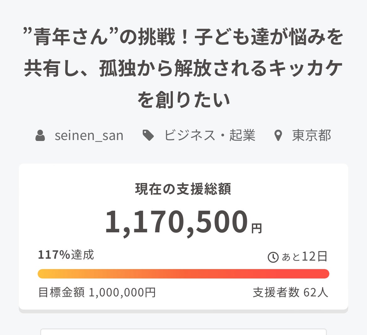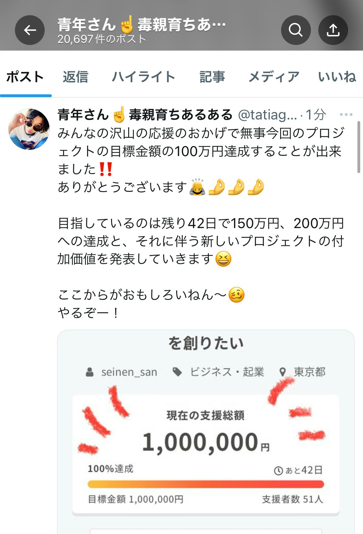 2024/06/18 19:03プロジェクトページをご覧いただきありがとうございます!僕は『青年さん』という名前でTikTokを中心に活動をしています。今回こちらのクラウドファンディングを通して出会ったスポンサー様と『10代の子供たちの居場所を作る』新たな取り組みにチャレンジすることになりました!皆様の応援のおかげで素敵なご縁に巡り合うことができました。本当に感謝しています!!現在なんと117万円を超える支援をいただいておりますが、残り12日で150万円を目標にネクストゴールを設定しました。今はクラファンが終わってからのリターンや無料イベントをどんな風に満足度の高いものにするかそればかり考えております!最後まで駆け抜けますので、ぜひ初めましての方も応援よろしくお願い致します!! もっと見る