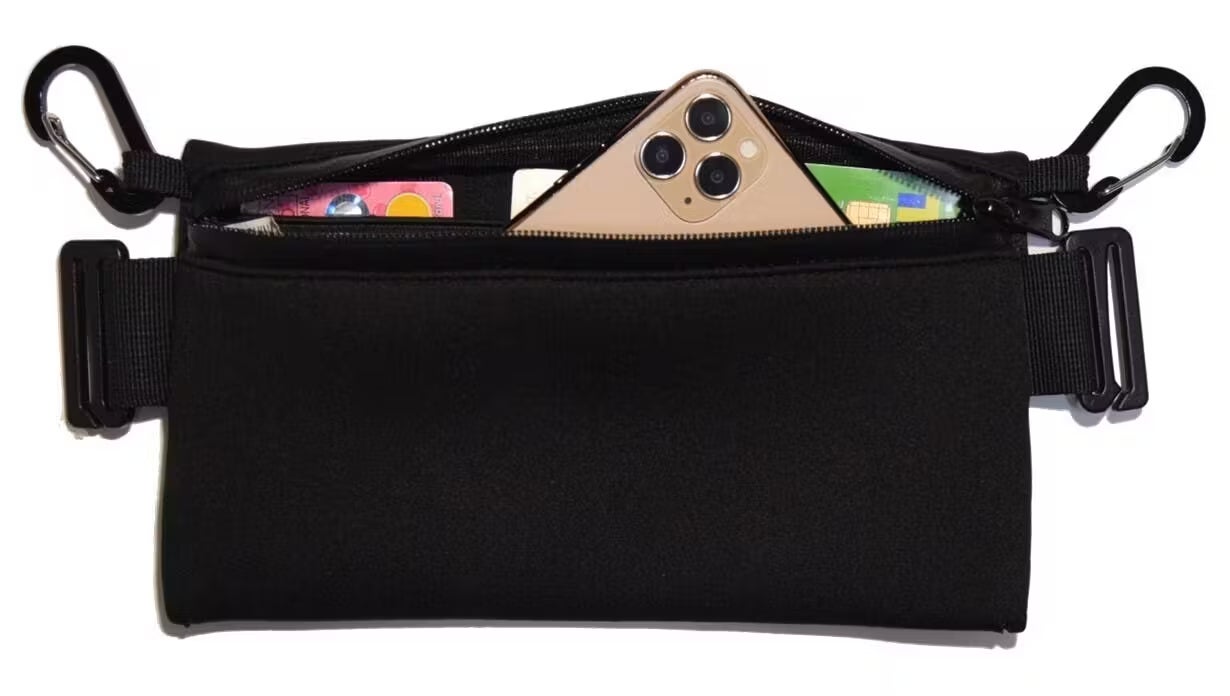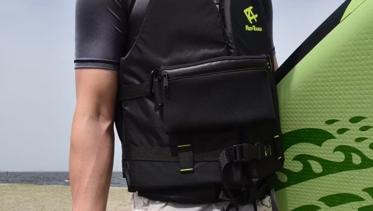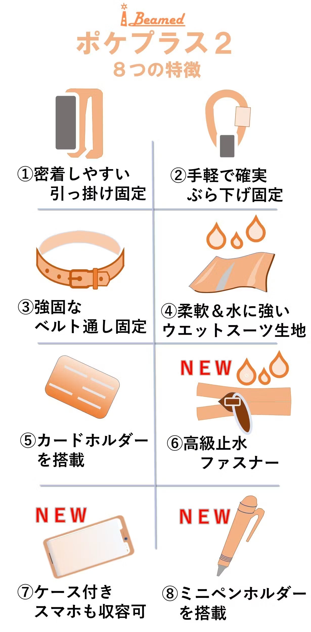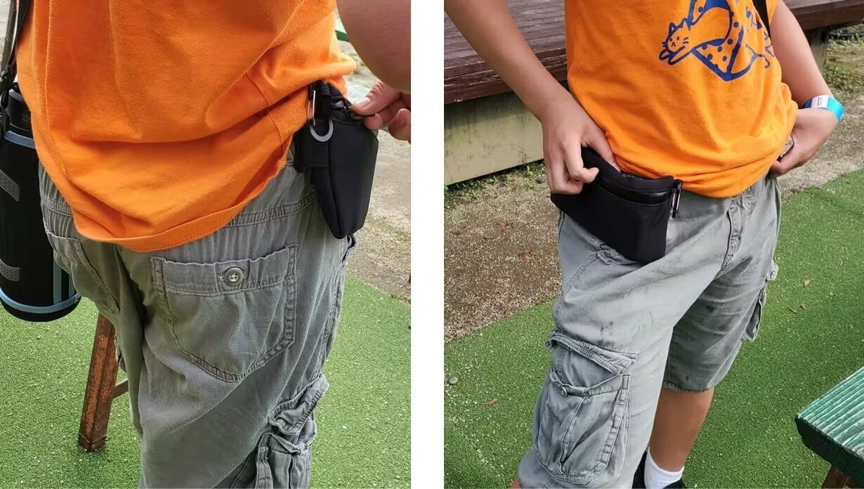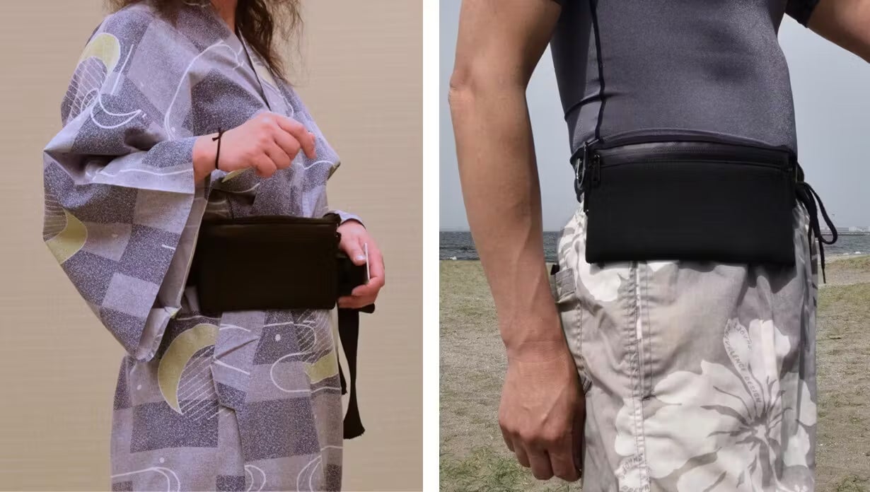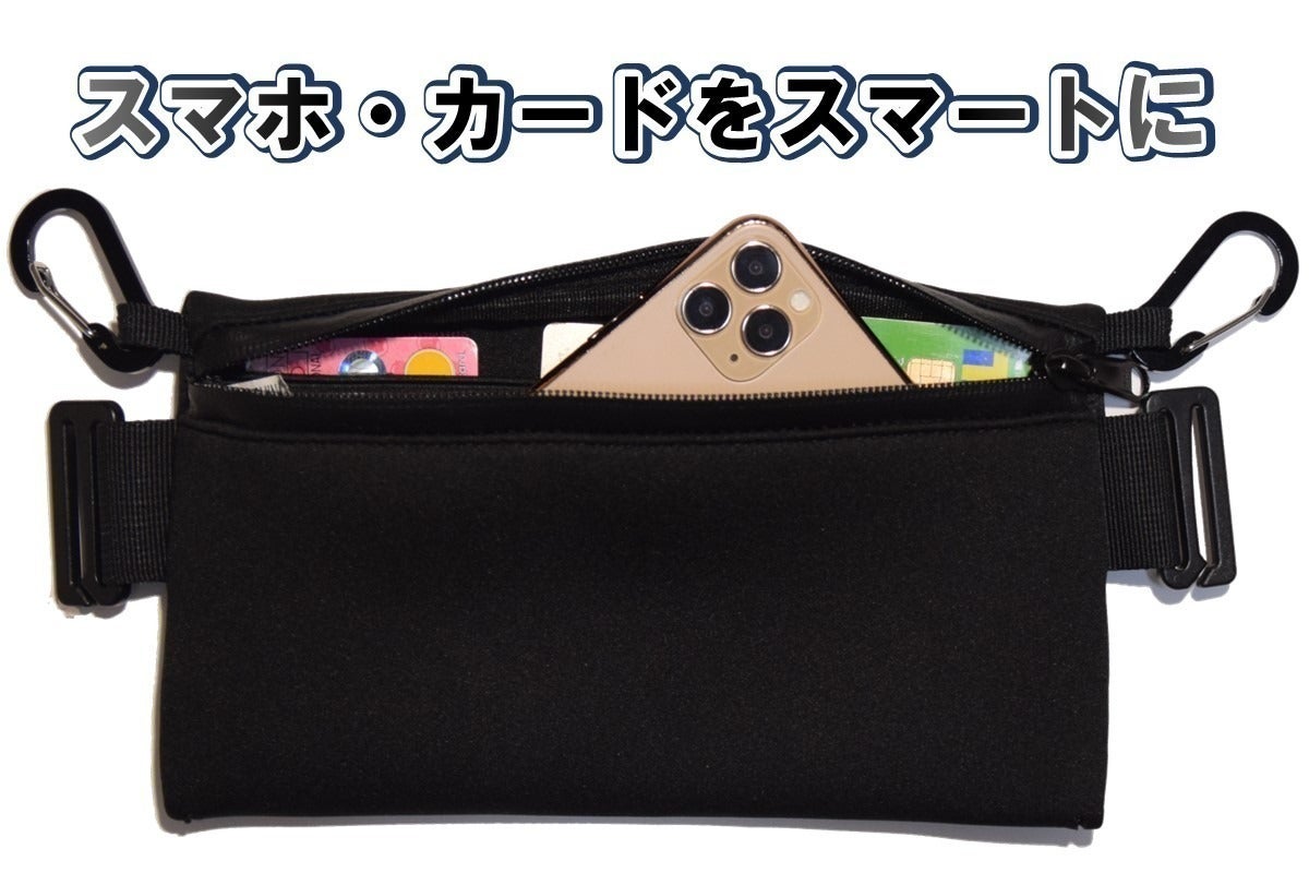 SUPなどの、動きや落水衝撃が予想されるアクティビティでは、首下げ等ではなく、より密着性の良い衣服のようなポーチが必要と考えました。