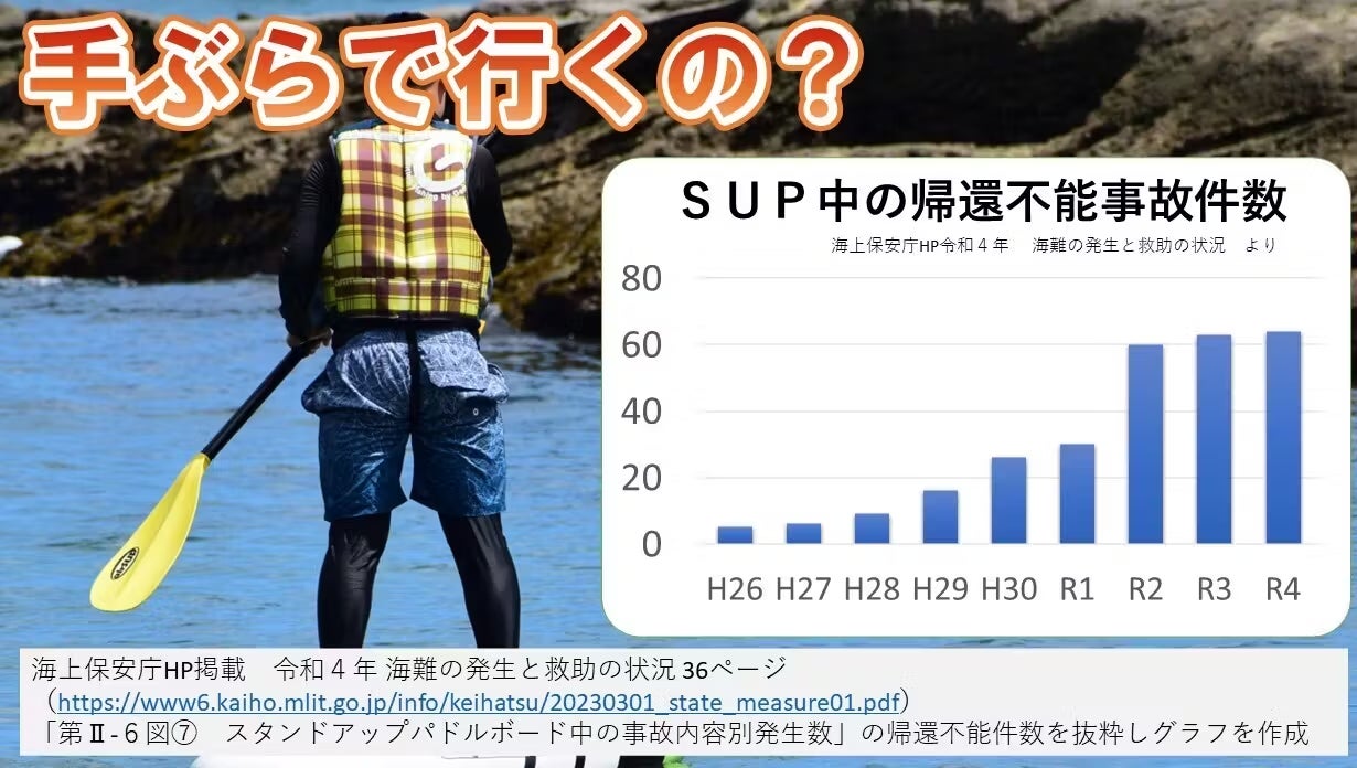 海辺でのレジャー用途にも近年では、SUPによる期間不能事故が多発傾向になっています。