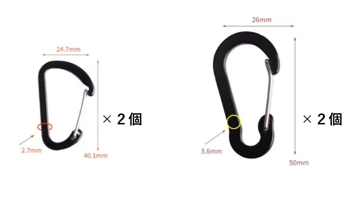 2種類のカラビナを同梱。ぶら下げにお使いいただきます。