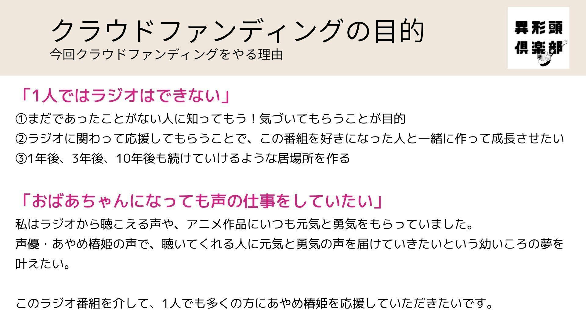 ラジオの制作費をファンドしてもらう事が目的ですが、