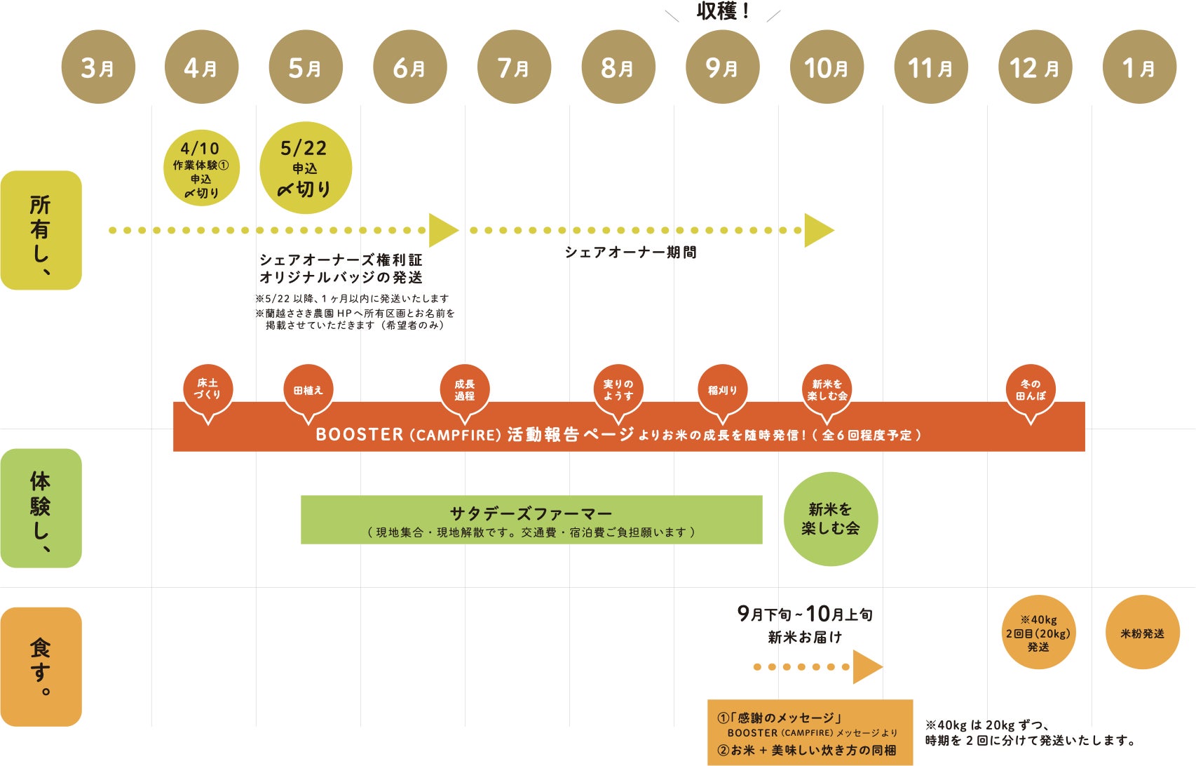- シェアオーナー期間の見学は自由、農作業体験もご参加可能です。(具体的なスケジュールは、画像をご参照ください。)農作業用の道具は用意しますので、動きやすい服装、長靴などの作業靴をご用意ください。