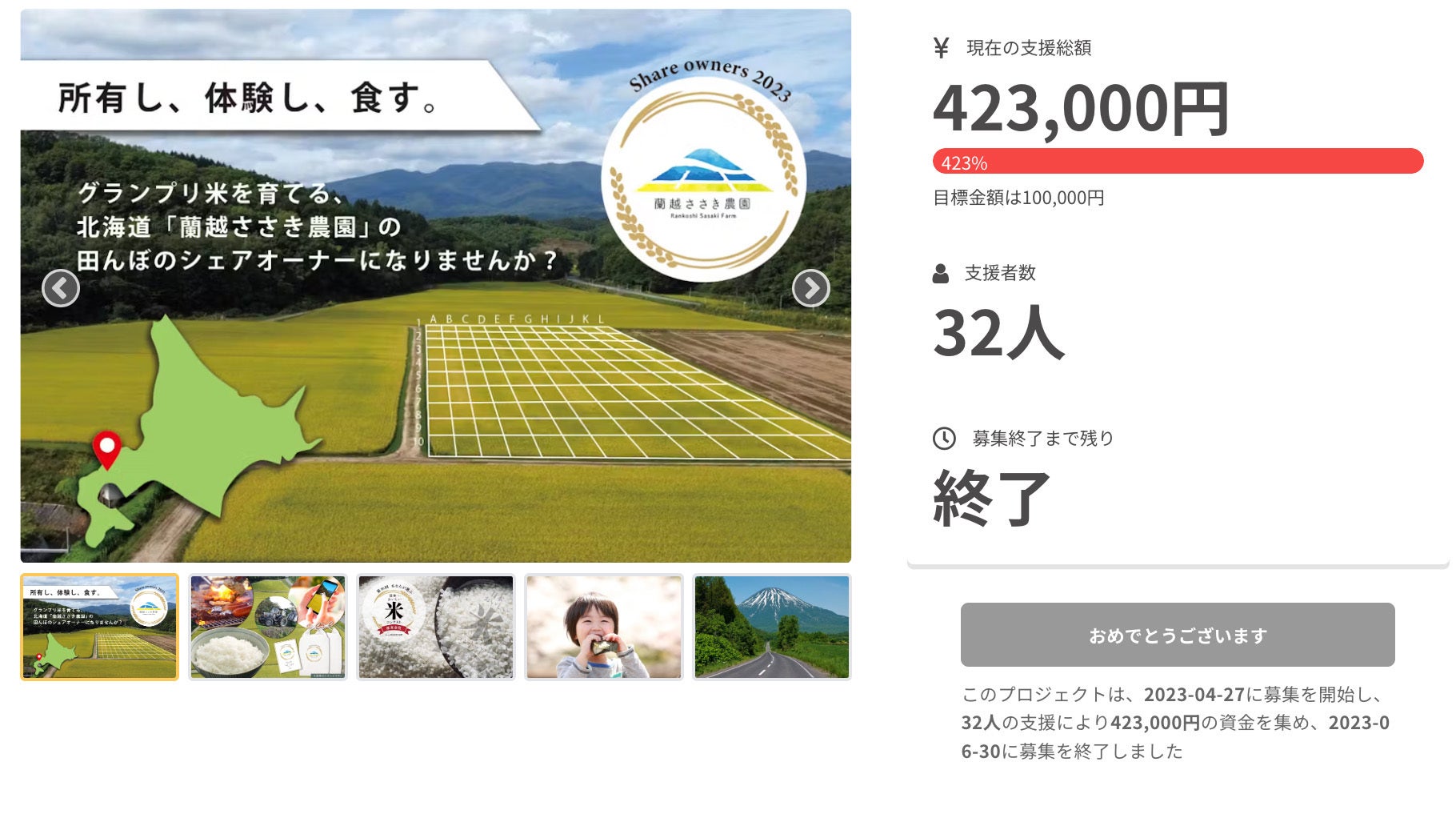 2023年「蘭越ささき農園シェアオーナーズ」企画は、ご支援くださった皆様のお陰で目標金額の 423%を達成いたしました。「美味しかったよ」という嬉しいお声もいただき、大変励みになりました。本当にありがとうございました!