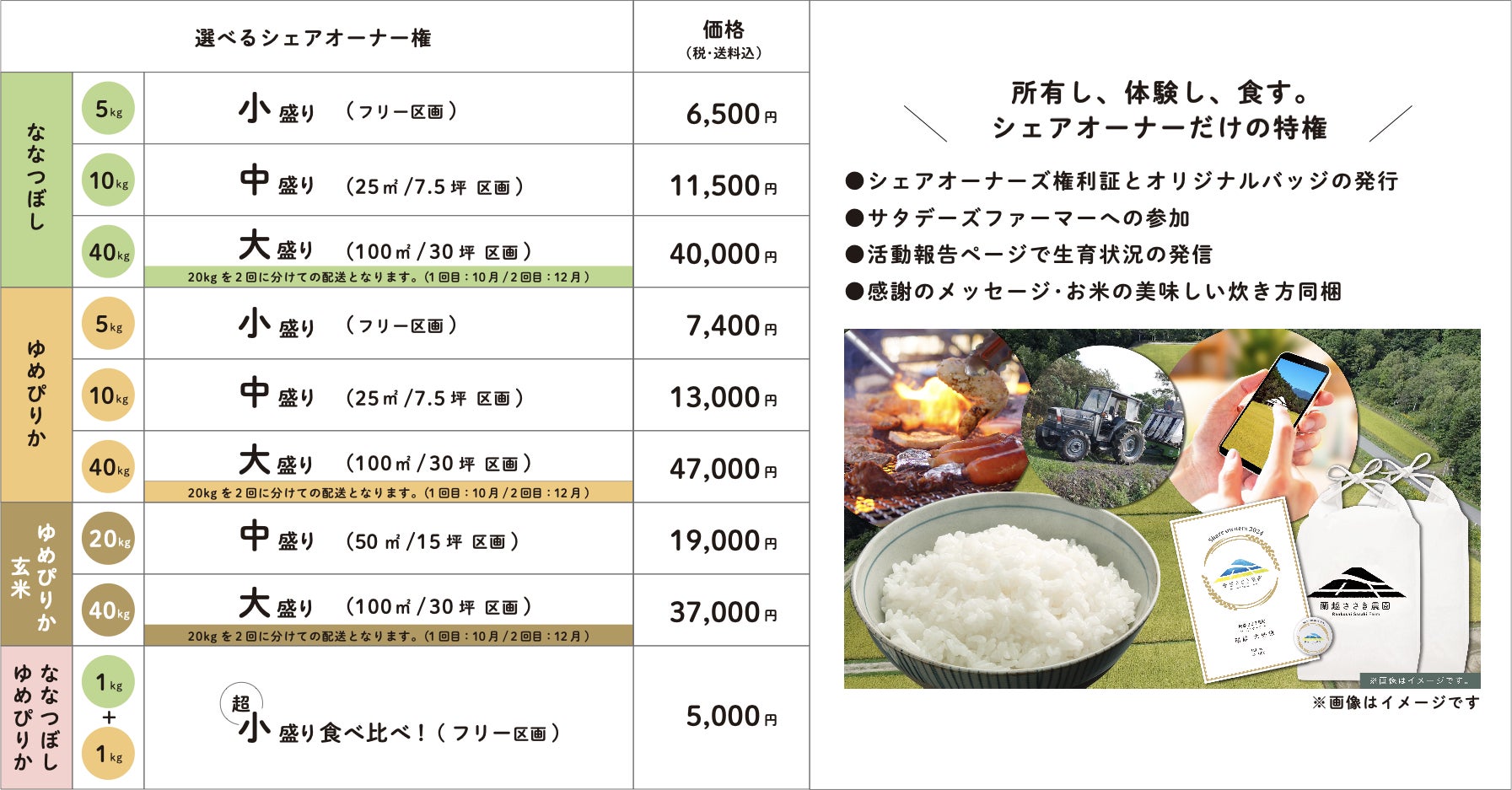 グランプリ米の田んぼを一区画所有することができ、収穫後(9月下旬~10月初旬)に確実にいち早くお米をゲットできます。品種は、「ゆめぴりか」「ななつぼし」のいずれかより選んでいただくことができます。また、シェアオーナーになっていただいた方には5月~10月までの約半年間、田んぼ所有権を証明するシェアオーナーズ権利証とオリジナルバッジお届けいたします。