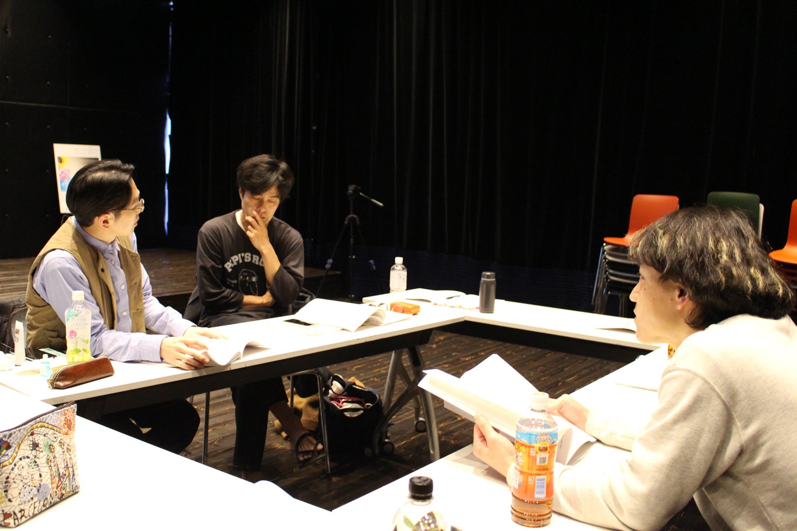 作品の理解や台詞の解釈について熱心に議論する酒巻誉洋・加藤亮佑・新井聖二