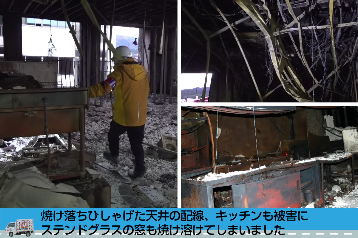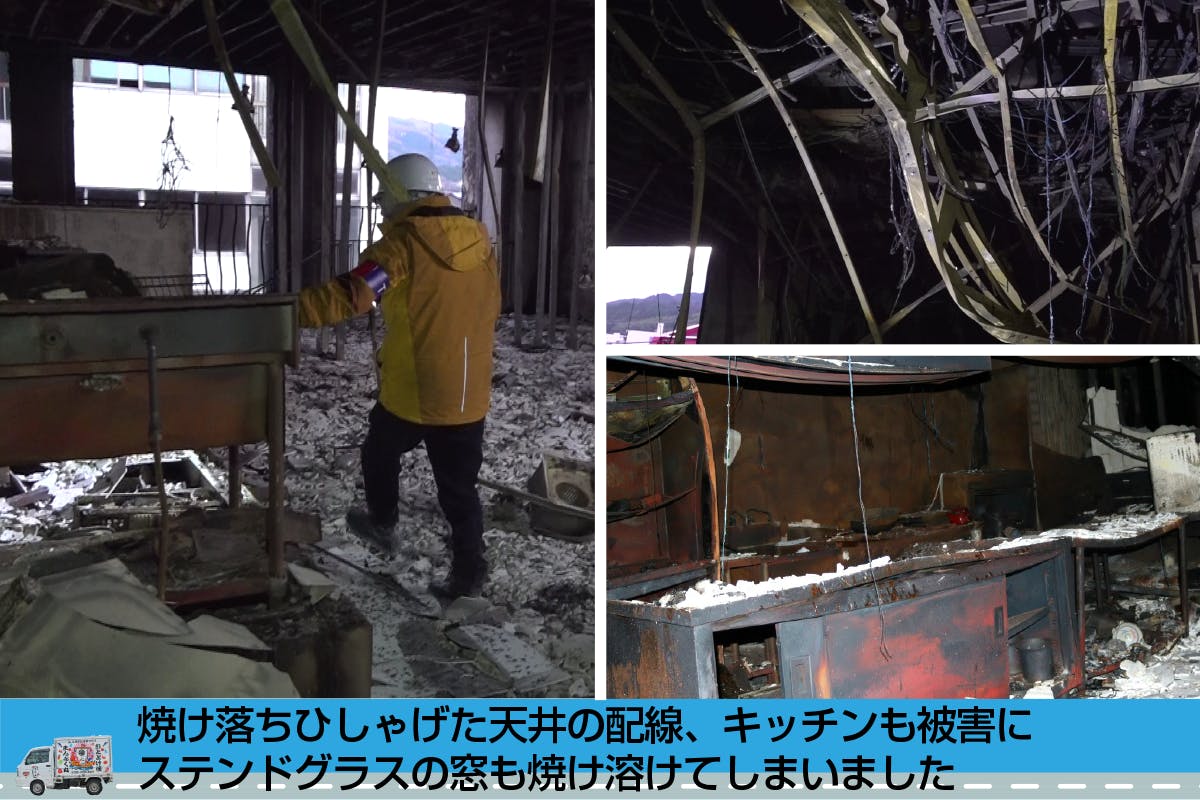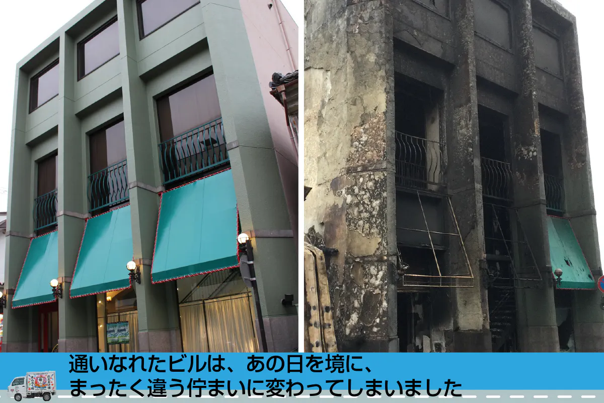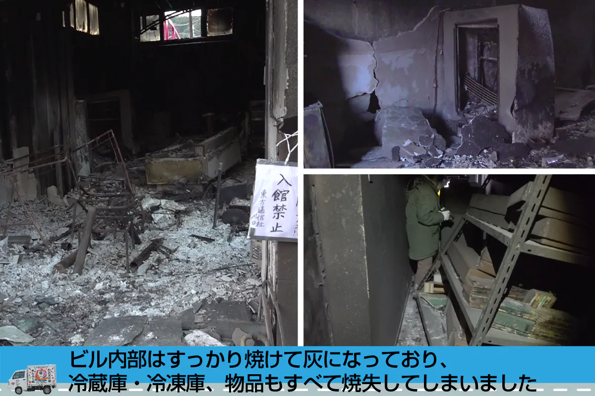 鎮火後に社屋を見に行くと、建物自体は残りましたが、あまりにも火勢が強かったのか、窓という窓が破られ、壁は煤で真っ黒になった上に、移動販売車も冷蔵冷凍設備もすべてが灰になっていました。