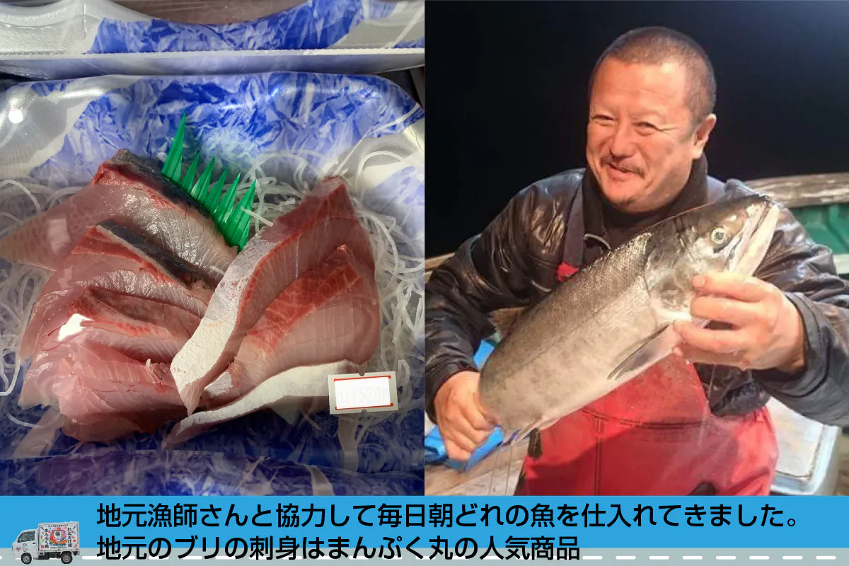 「まんぷく丸」の売りは、人気商品の新鮮な朝どれ魚の刺身や干物、地元老舗食品店のお惣菜、そして販売員さんの細やかな気配りです。