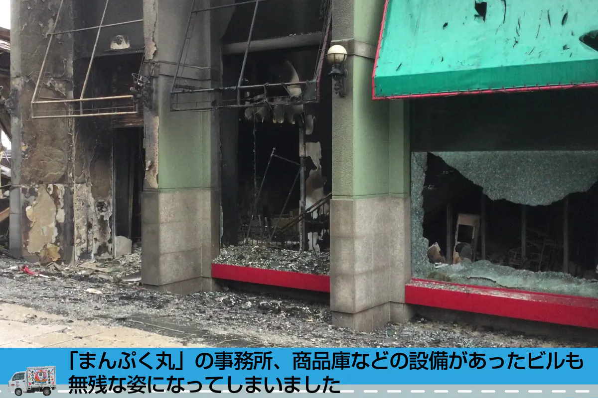 しかし現状は厳しいです。仕入れ先の干物屋さんは全焼し、惣菜店、肉屋さんも半壊状態で水も電気もない、「まんぷく丸」の一番人気だった地物魚のお刺身も、漁港が壊滅してしまって作れないという状況です。それより何より、移動販売車の「まんぷく丸」自体がありません。「まんぷく丸」を送り出す社屋・倉庫も設備もすべてありません。