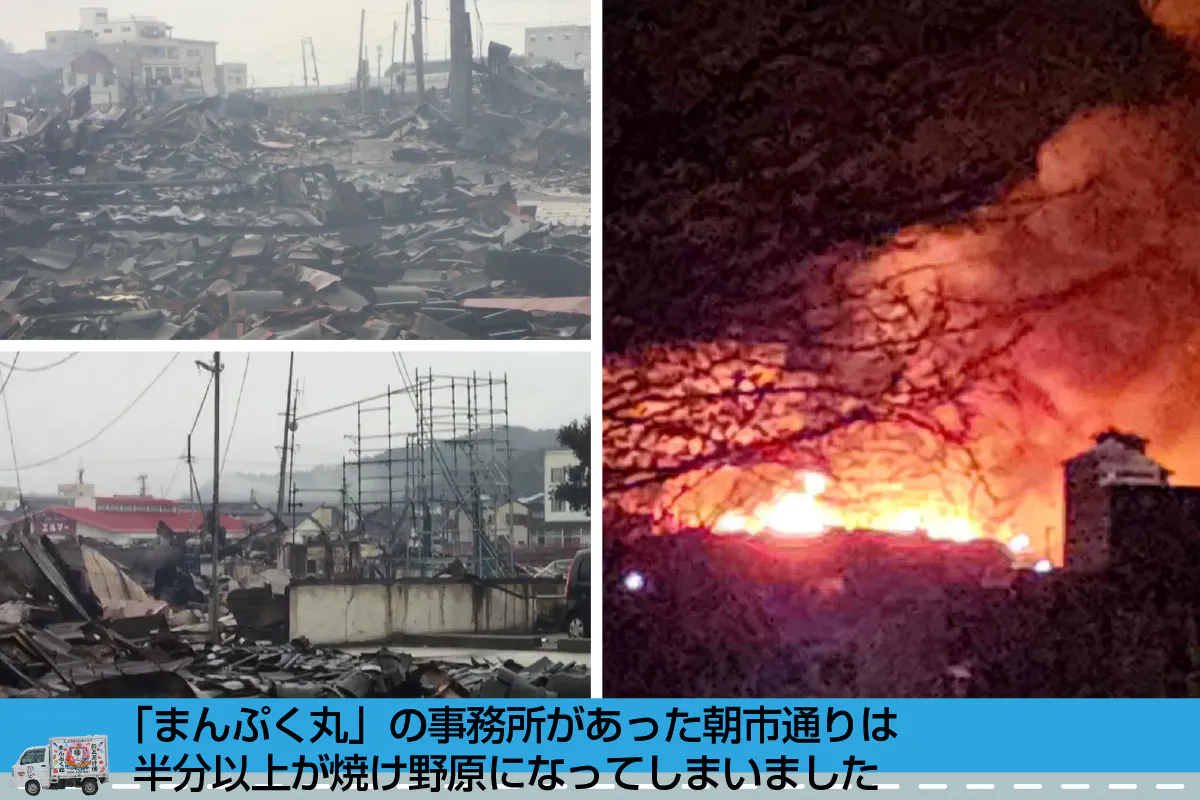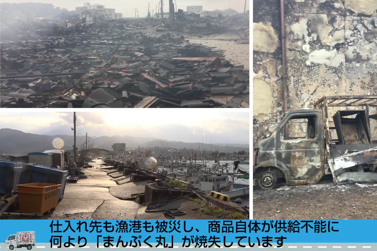 しかし能登半島地震の揺れと火災で車両・社屋ともに焼失し、継続不能になりました。それでも、かならずや移動販売車「まんぷく丸」を復活し、もう一度地域に笑顔を、と準備しています。