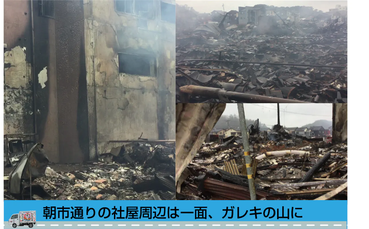 1200年の歴史を持つ「輪島朝市」、その朝市入り口の3階建てビルが当社でした。ビルは能州フォーラムといい、NHK連続ドラマ「まれ」(土屋太鳳主演)の舞台となった赤い鉄橋(いろは橋)がかかる河原田川の川沿いにあります。「朝市通り入口」と記された石柱標識の立っている辺りのビルです。今、付近一帯は焼け野原で、私たちのビルも延焼によって焼け焦げ、見る影もない状態になっています。