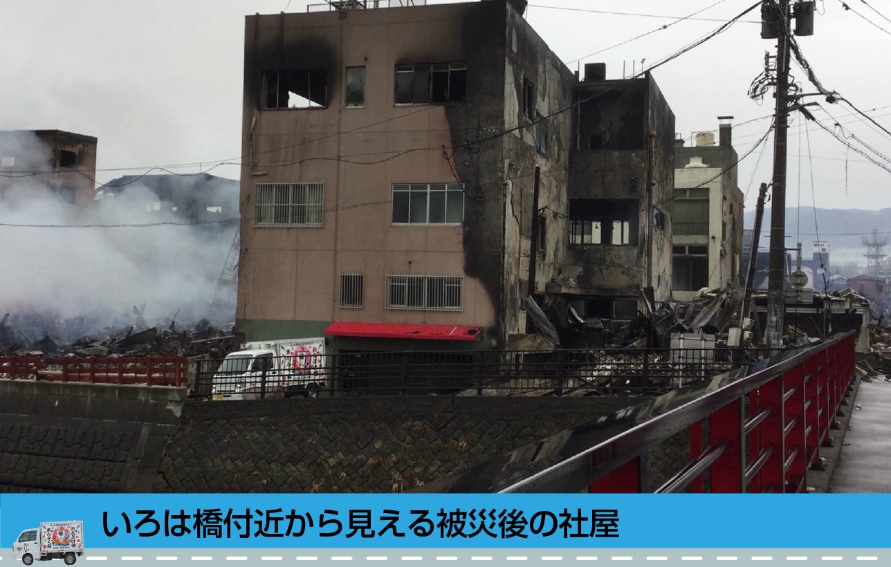 1200年の歴史を持つ「輪島朝市」、その朝市入り口の3階建てビルが当社でした。ビルは能州フォーラムといい、NHK連続ドラマ「まれ」(土屋太鳳主演)の舞台となった赤い鉄橋(いろは橋)がかかる河原田川の川沿いにあります。「朝市通り入口」と記された石柱標識の立っている辺りのビルです。今、付近一帯は焼け野原で、私たちのビルも延焼によって焼け焦げ、見る影もない状態になっています。
