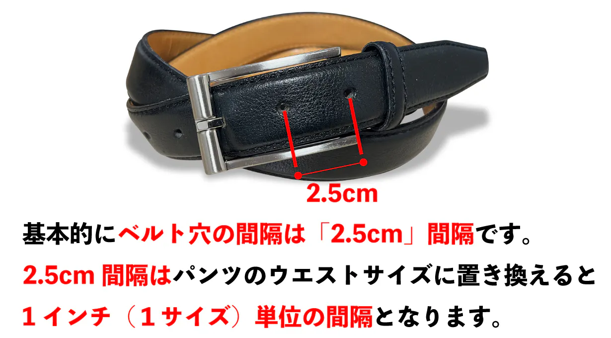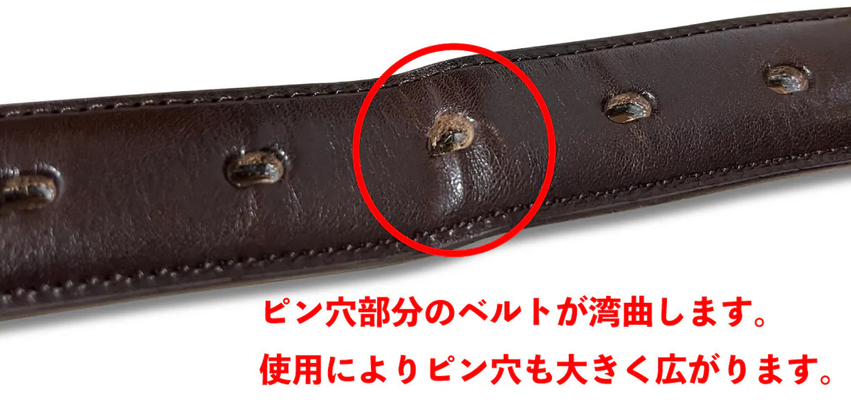 ①一般的なベルトは「ベルト穴で調整」のため2.5cm / 1インチ単位での調整となります。これだとゆるゆるになってしまいますよね。また使用頻度によりベルト穴部分が劣化します。
