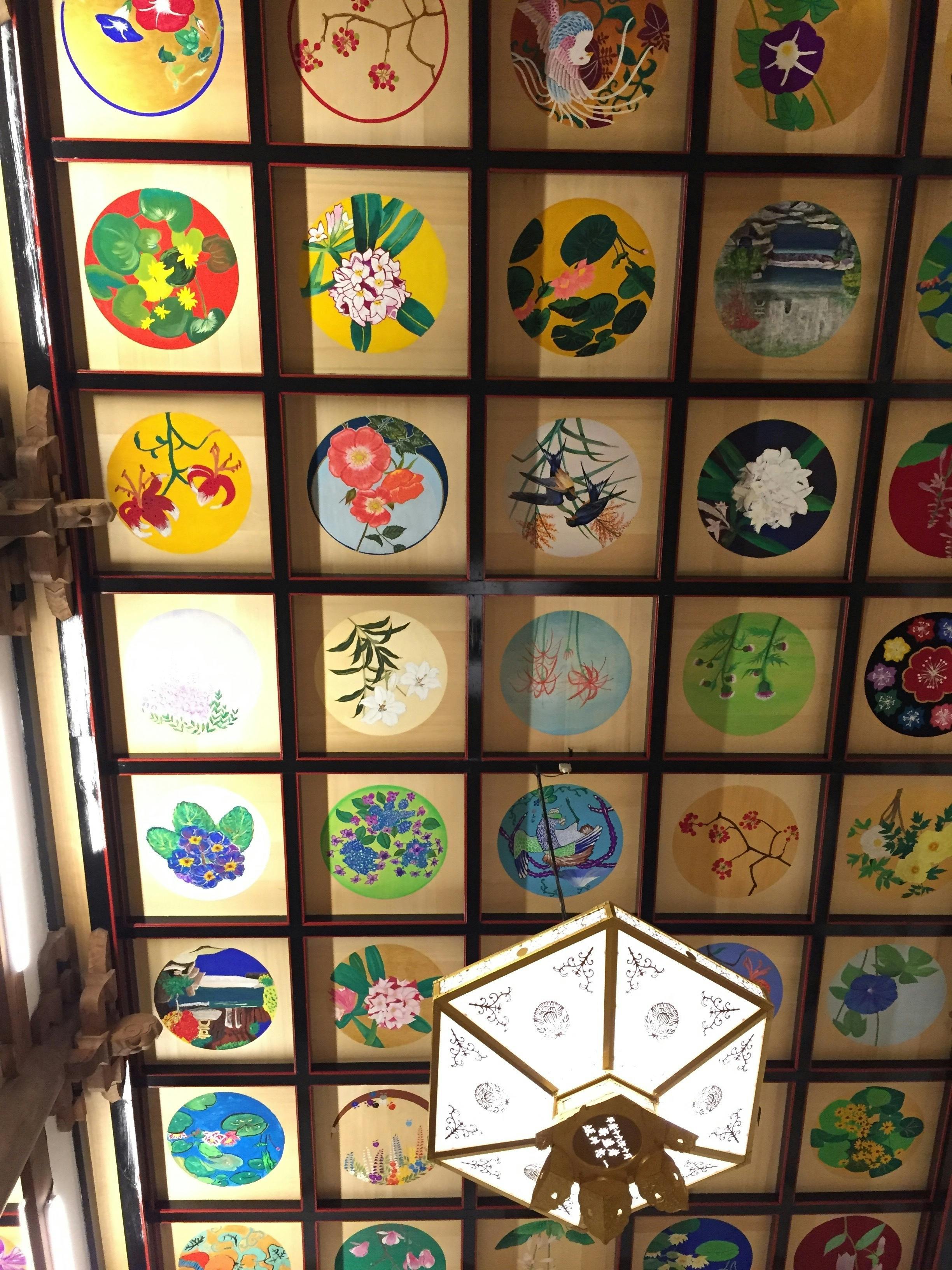 2021年5月1日に張替え工事が完了した本堂の天井です。能登里山の花々を仏様にお供えする天井画を奉納するために、石川県出身の洋画家であられる浄福寺西房浩二住職にご指導賜り、教室の生徒様からのご協力もいただきました。また東京都の水墨画家であられる妙清寺本多良之住職のご教授のもと墨英會の先生方にも筆をとっていただきました。さらに、地元の高名な先生方、絵を描くことを喜びとされる趣味のある方、お寺のためなら描いてみようおっしゃってくださった御門徒の方々、総勢170名の方々に協力していただき、合計190枚の天井絵を奉載させていただくことが出来ました。