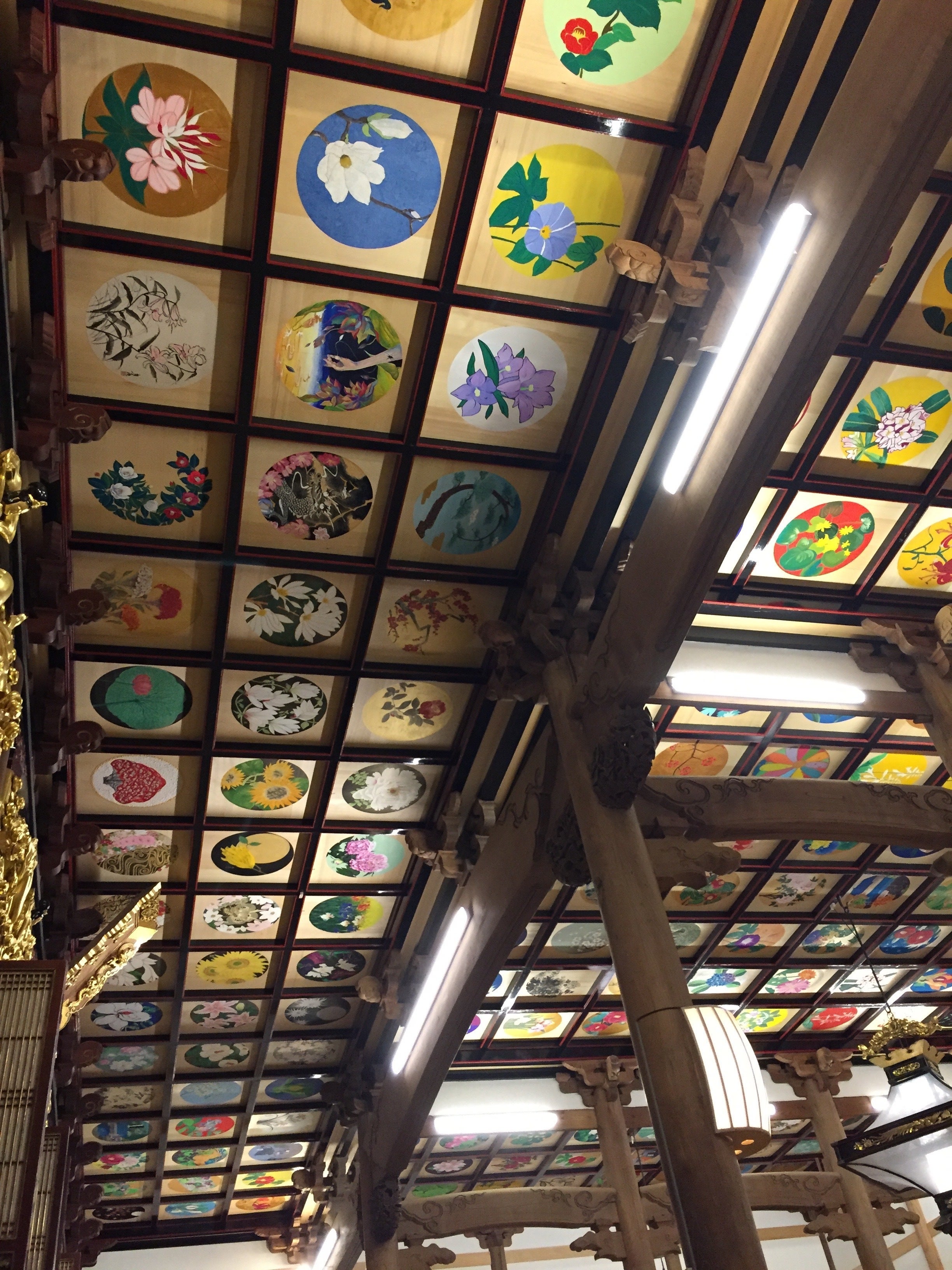 2021年5月1日に張替え工事が完了した本堂の天井です。能登里山の花々を仏様にお供えする天井画を奉納するために、石川県出身の洋画家であられる浄福寺西房浩二住職にご指導賜り、教室の生徒様からのご協力もいただきました。また東京都の水墨画家であられる妙清寺本多良之住職のご教授のもと墨英會の先生方にも筆をとっていただきました。さらに、地元の高名な先生方、絵を描くことを喜びとされる趣味のある方、お寺のためなら描いてみようおっしゃってくださった御門徒の方々、総勢170名の方々に協力していただき、合計190枚の天井絵を奉載させていただくことが出来ました。