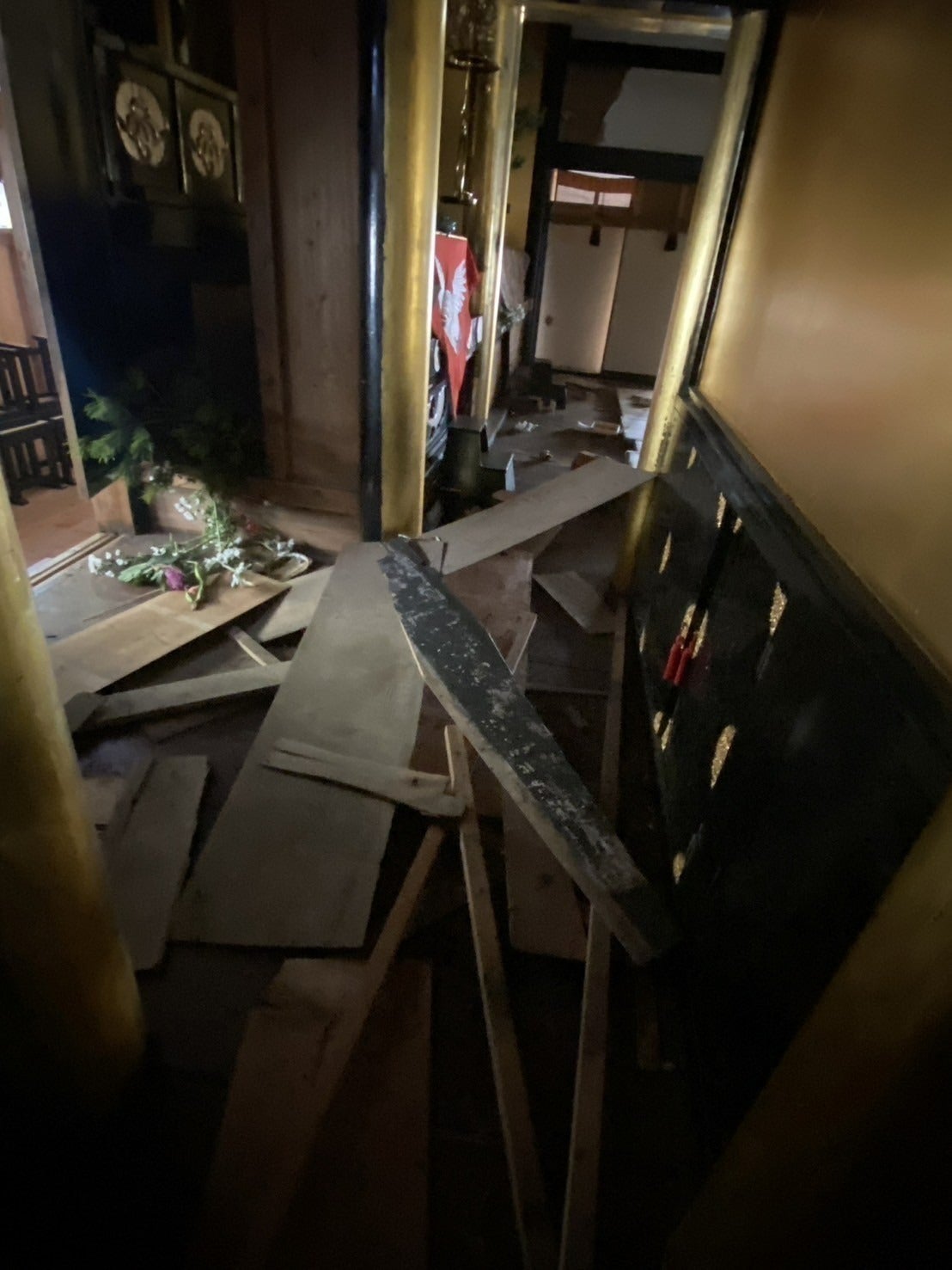 現在、能登地方の復興が進んでおりますが人手が足りず当寺を含む一部地域では断水が続いております。そのためなかなか修復に向けた大工さんによる被害状況の確認や、見積もりなどが取れません。現在は瓦礫などを撤去しつつ、展示品を安全な場所に避難させております。