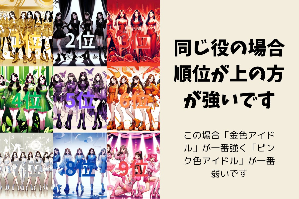 まず、『アイドルグループカード』全9枚を使い色別のアイドルランキングを1位から9位まで決定します。