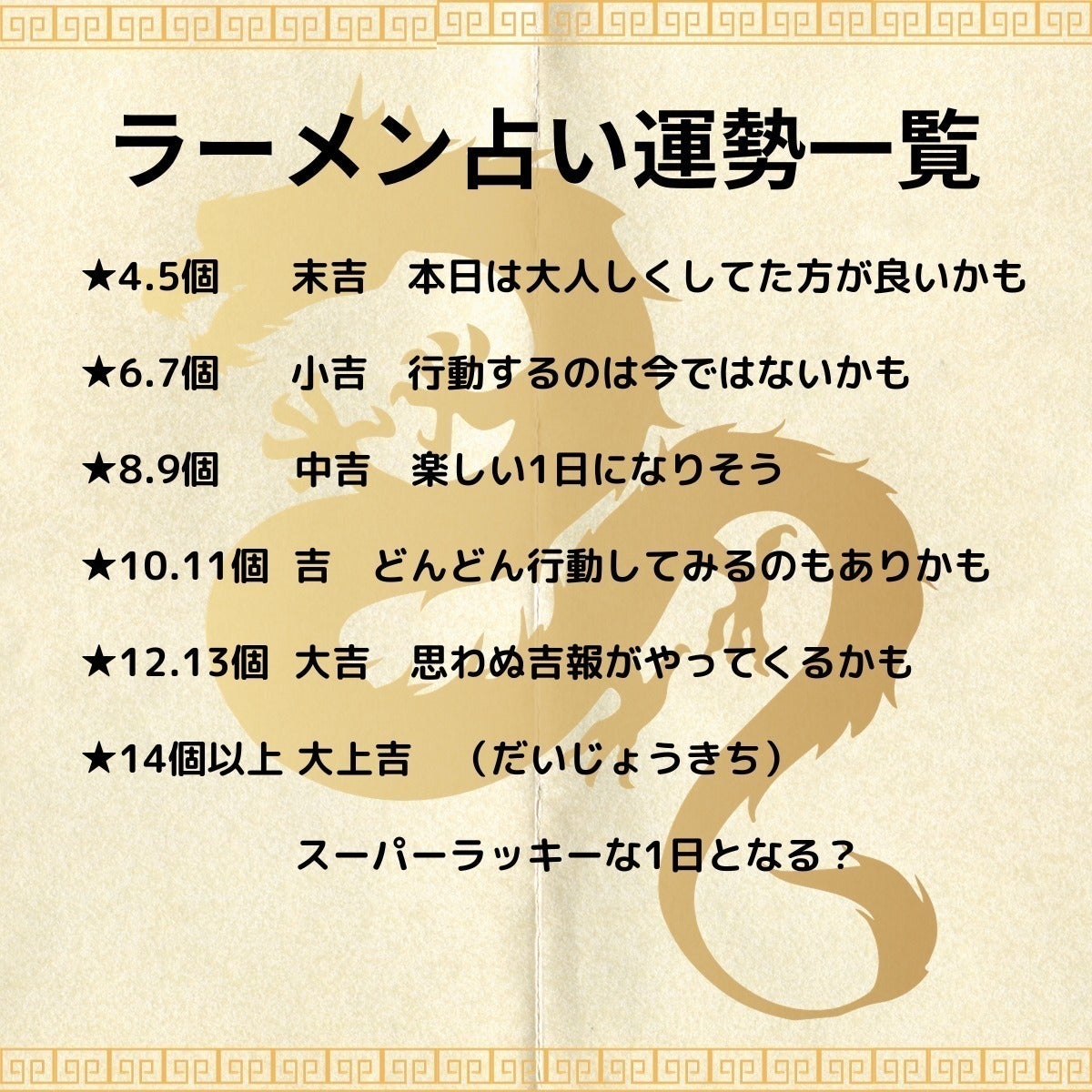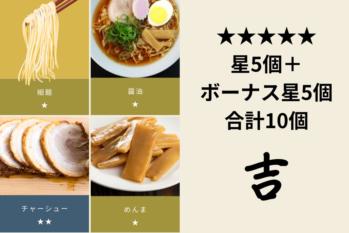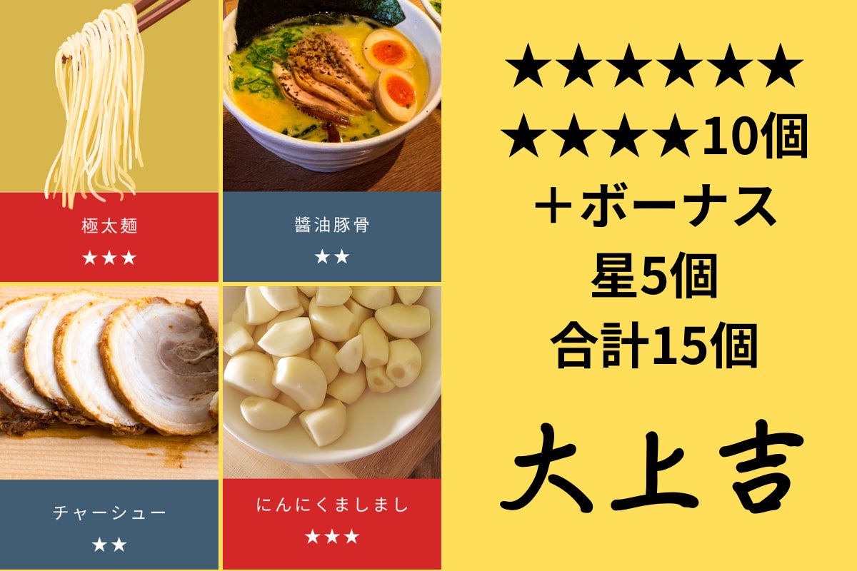 最終的に4枚の★合計とボーナスがあればボーナスの★の合計を合わせた数を、ラーメン占い運勢一覧表から導き出してみてください。