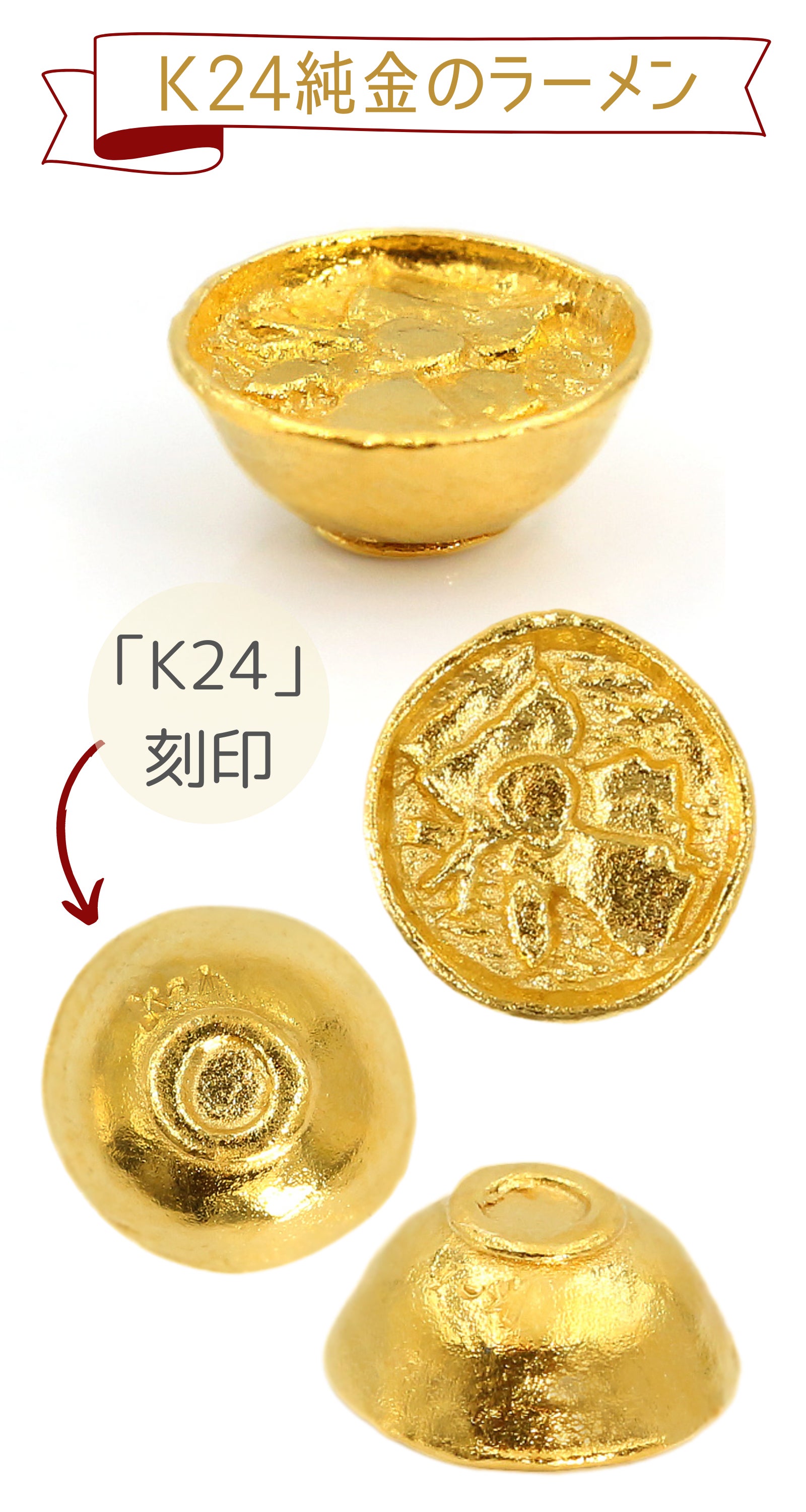今回は、「ラーメン愛」のテーマに合わせた「純金のラーメンのお守り」を販売させていただきます。