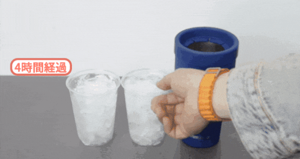 同じ2つのカップを1つはそのまま、1つはHAMILO タンブラーに入れて氷が溶ける時間を確認してみました。