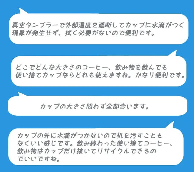 1つのタンブラーで市販のほぼすべての使い捨てカップに使用可能です。