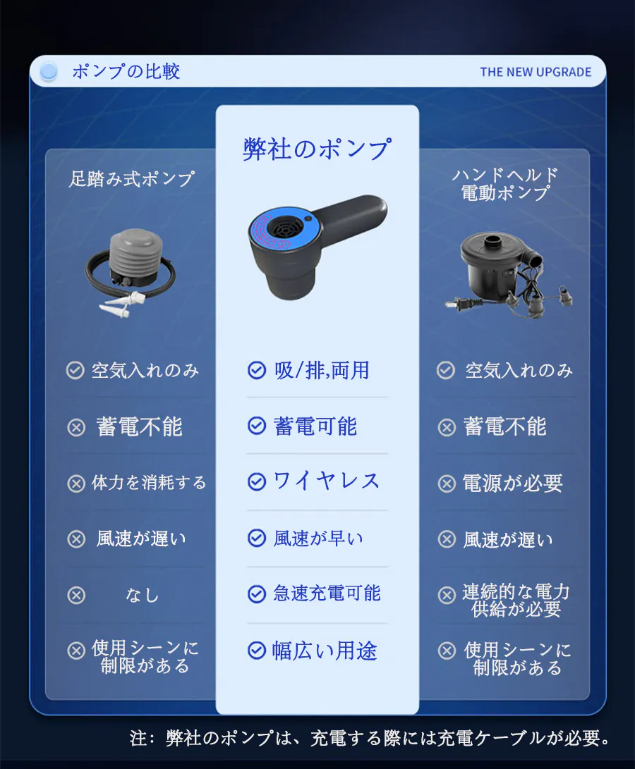 3.当社の充気ポンプ:充気・抽気両用が可能で、蓄電機能があり、ハンドフリーで利用できます。風速調整が可能で、充気速度が速いです。使用シーンに制限がありません。