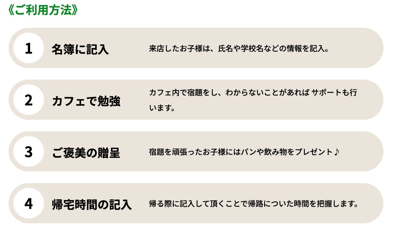 地域の子供達が放課後に来ることの出来る、塾や図書館とは違うサードプレイスです。子供の学習習慣を支える場所として、15時30分から17時までを、宿題カフェとして解放し、子供の自由意思で通え、 その上でパンを子供食堂のように無償で提供しております。