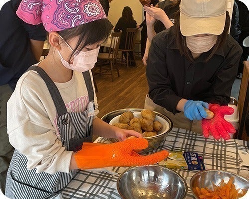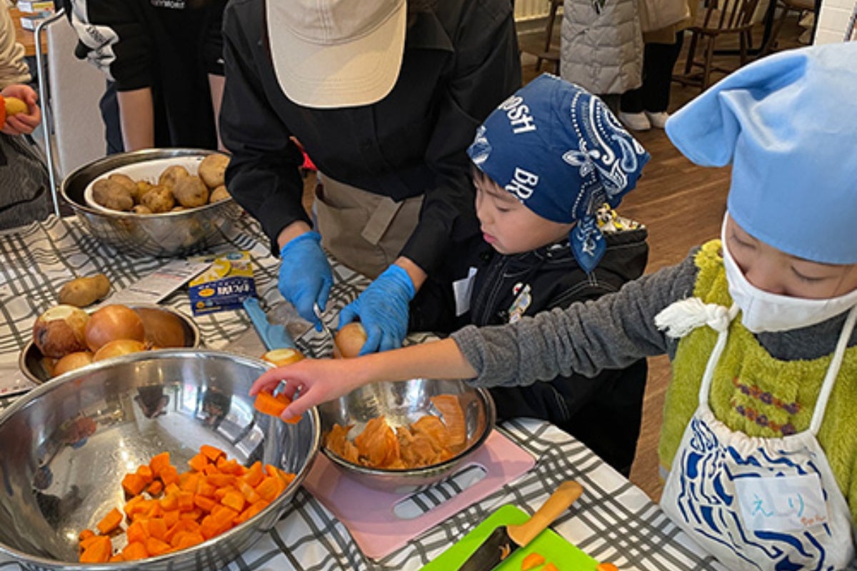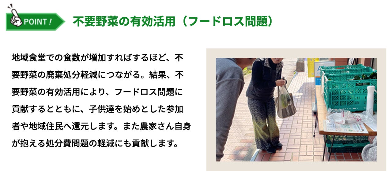 今現在、奈良中央卸売市場から寄付していただいている規格外野菜(不要野菜)を使用しております。この野菜は本来処分されるものであり、その量は膨大であり処分費の一部は県負担であるのが現状です。不要野菜の有効活用により、子供達を始めとした参加者や地域住民が育ててくれた農家さんへの感謝や食材のありがたみ感じるだけでなく、処分費の軽減につながる取り込みを行っています。